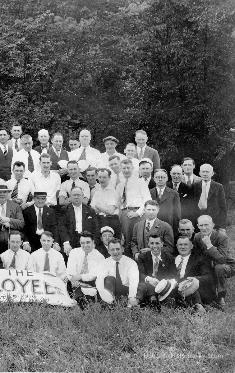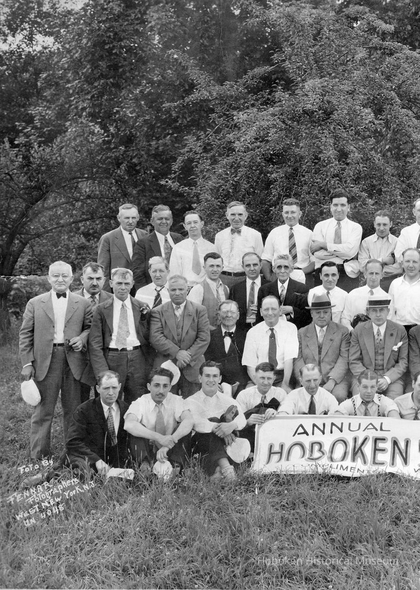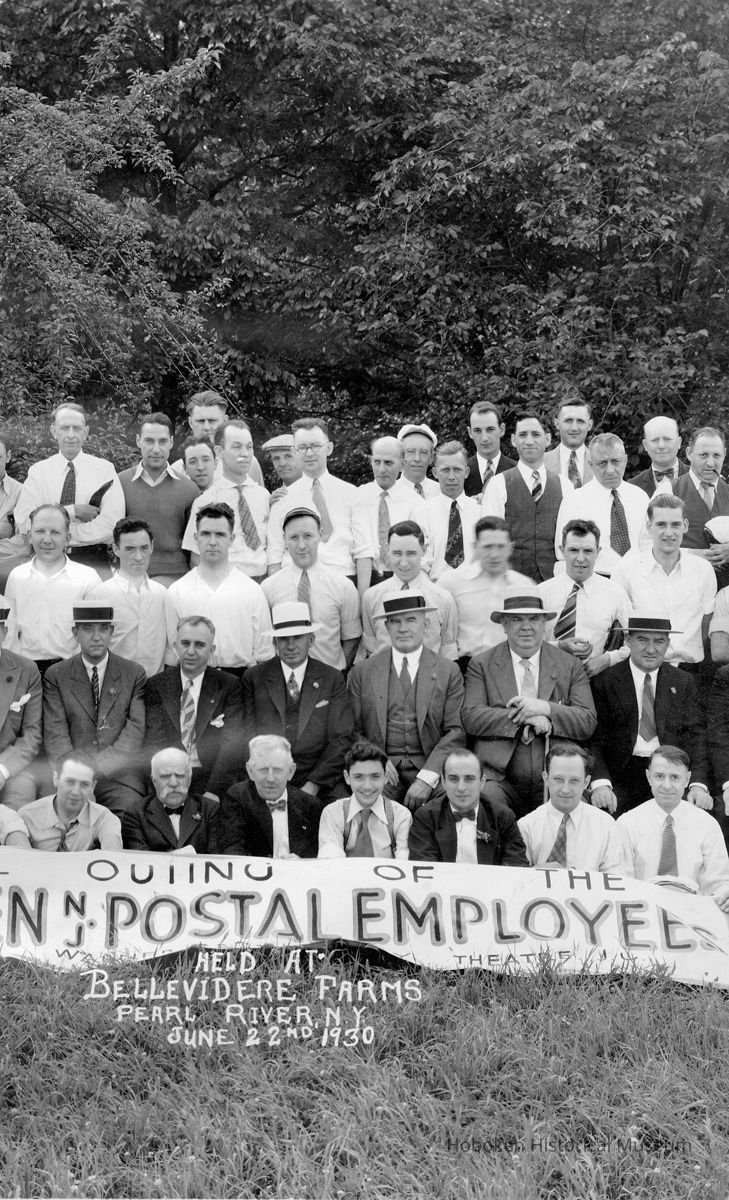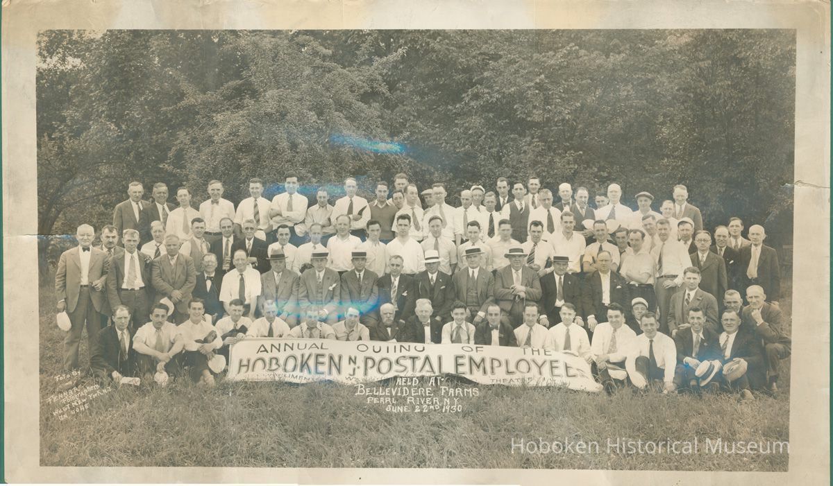 Sepia-tone group photo of the Annual Outing of the Hoboken, N.J. Postal Employees, Bellevidere (sic) Farms, Pearl River, N.J., June 22, 1930. 10.5" high x 18" wide image on 12" x 20" print. Captioning is in image. Reverse is blank. None of the people are identified.