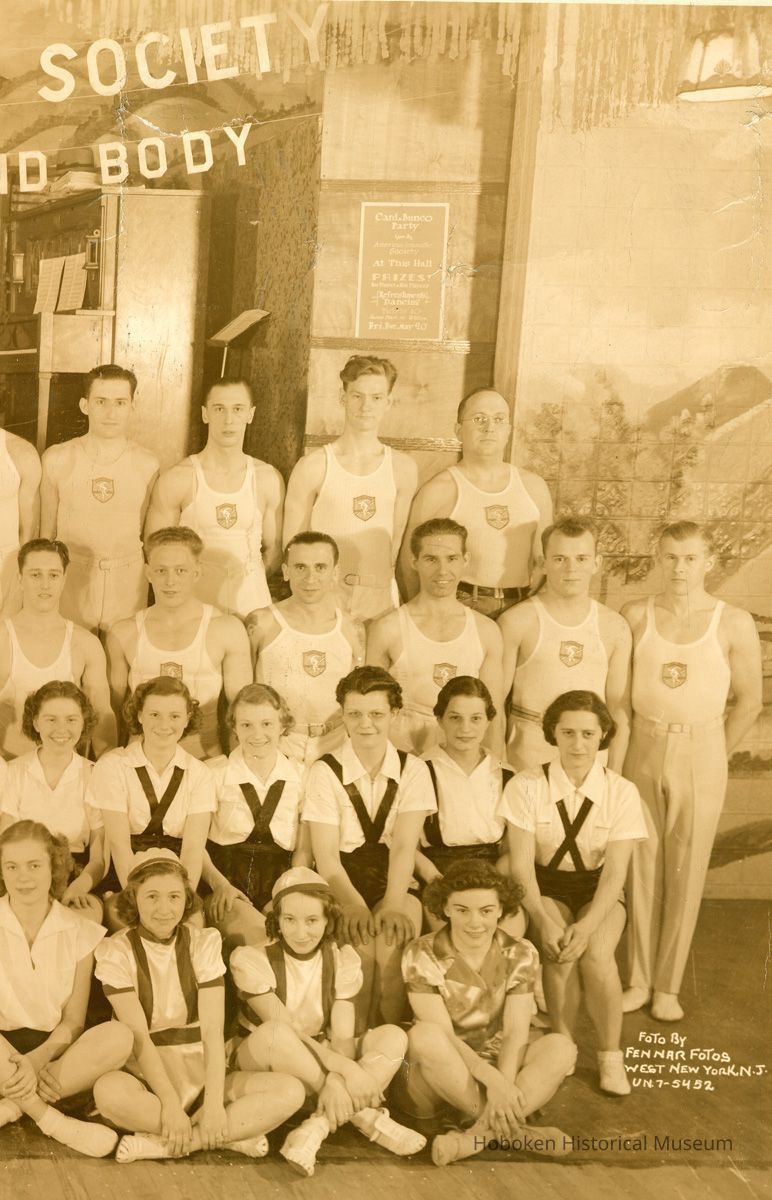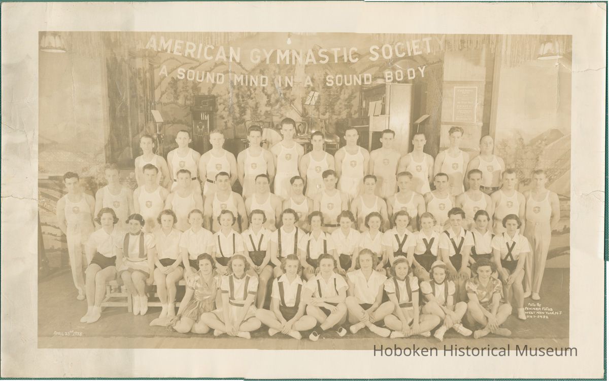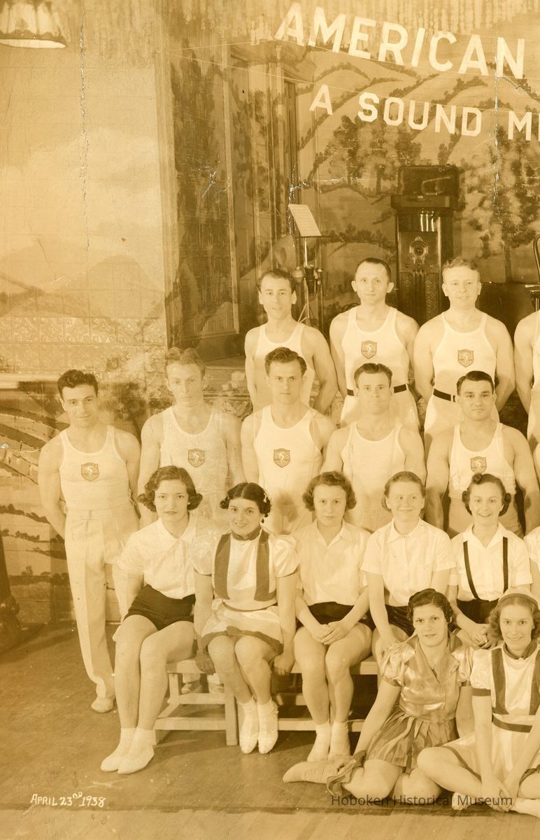 Sepia-tone group photo of American Gymnastic Society members posed in front of a stage at unknown place, probably in Hoboken, April 23, 1938. 10-1/8" high x 16-13/16" wide image on 12" x 17" print. Captioning is in image. Reverse is blank. None of the people are identified. There is wall sign at the right for "Card & Bunco Party" sponsored by them.