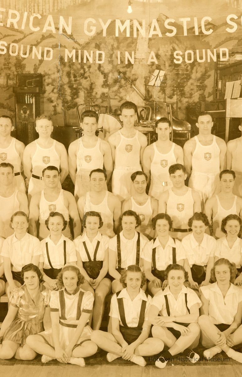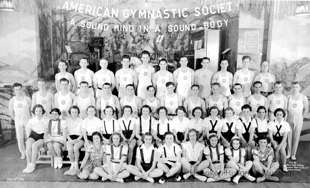 Sepia-tone group photo of American Gymnastic Society members posed in front of a stage at unknown place, probably in Hoboken, April 23, 1938.