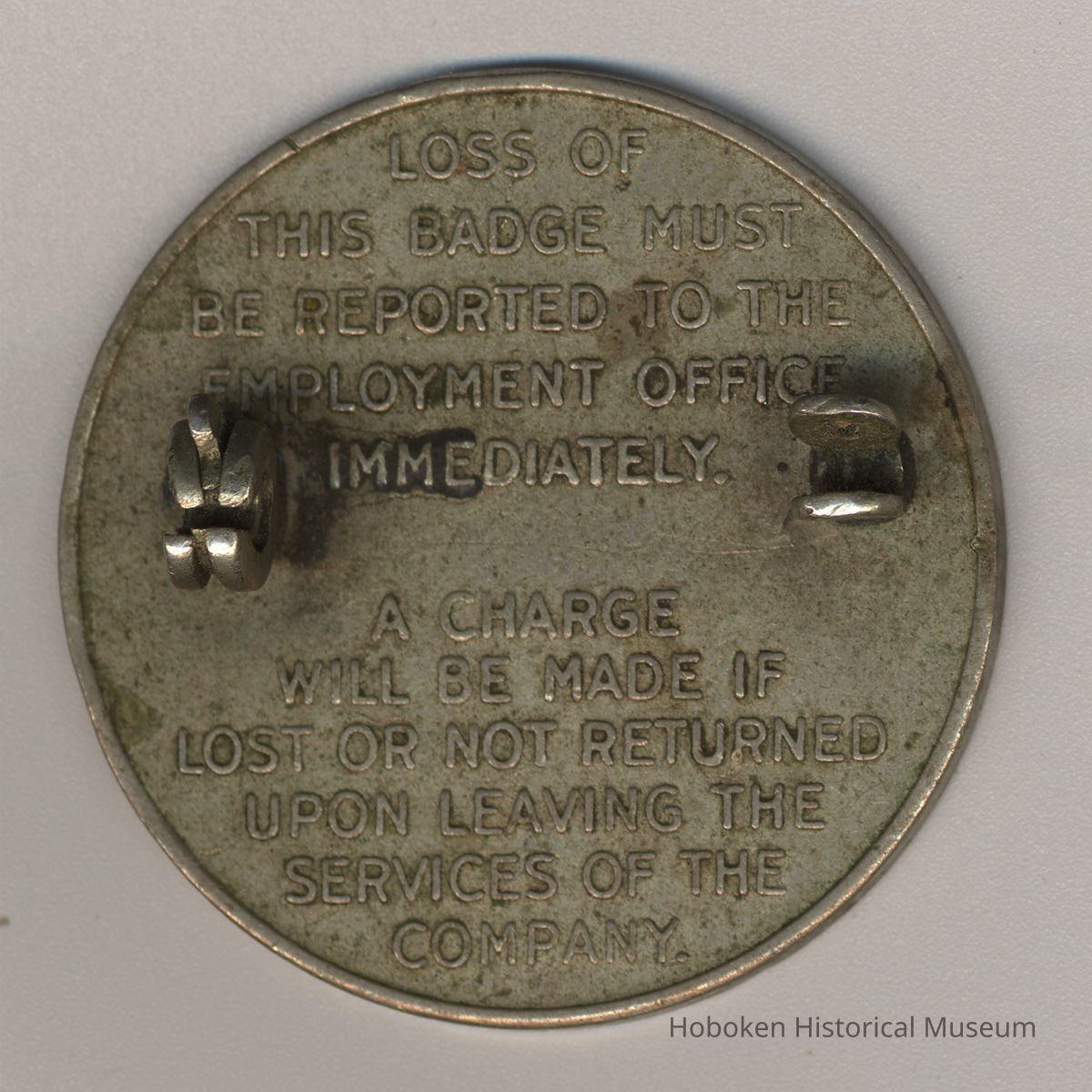 Employee identification pin-back badge, Bethlehem Steel Company, Shipbuilding Division, Hoboken Yard, no date, circa 1950-1980. Aluminum, 1-3/8" diameter; pin bar missing. Lettered on both sides.