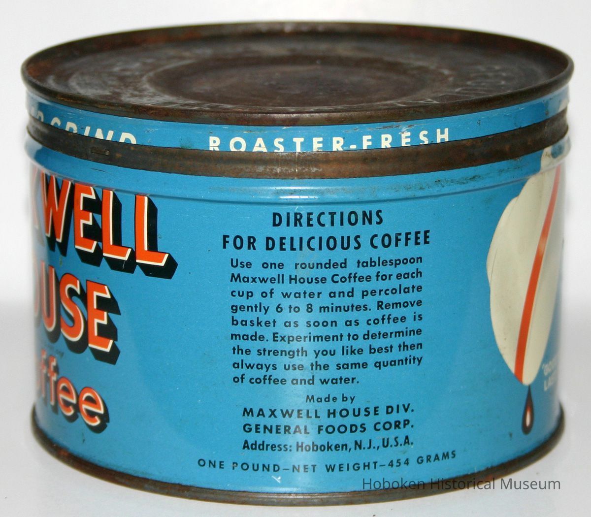 Can: Maxwell House Coffee, Regular Grind, one pound can. Maxwell House Division, General Foods Corp., Hoboken , N.J. No date, circa 1950-1960.