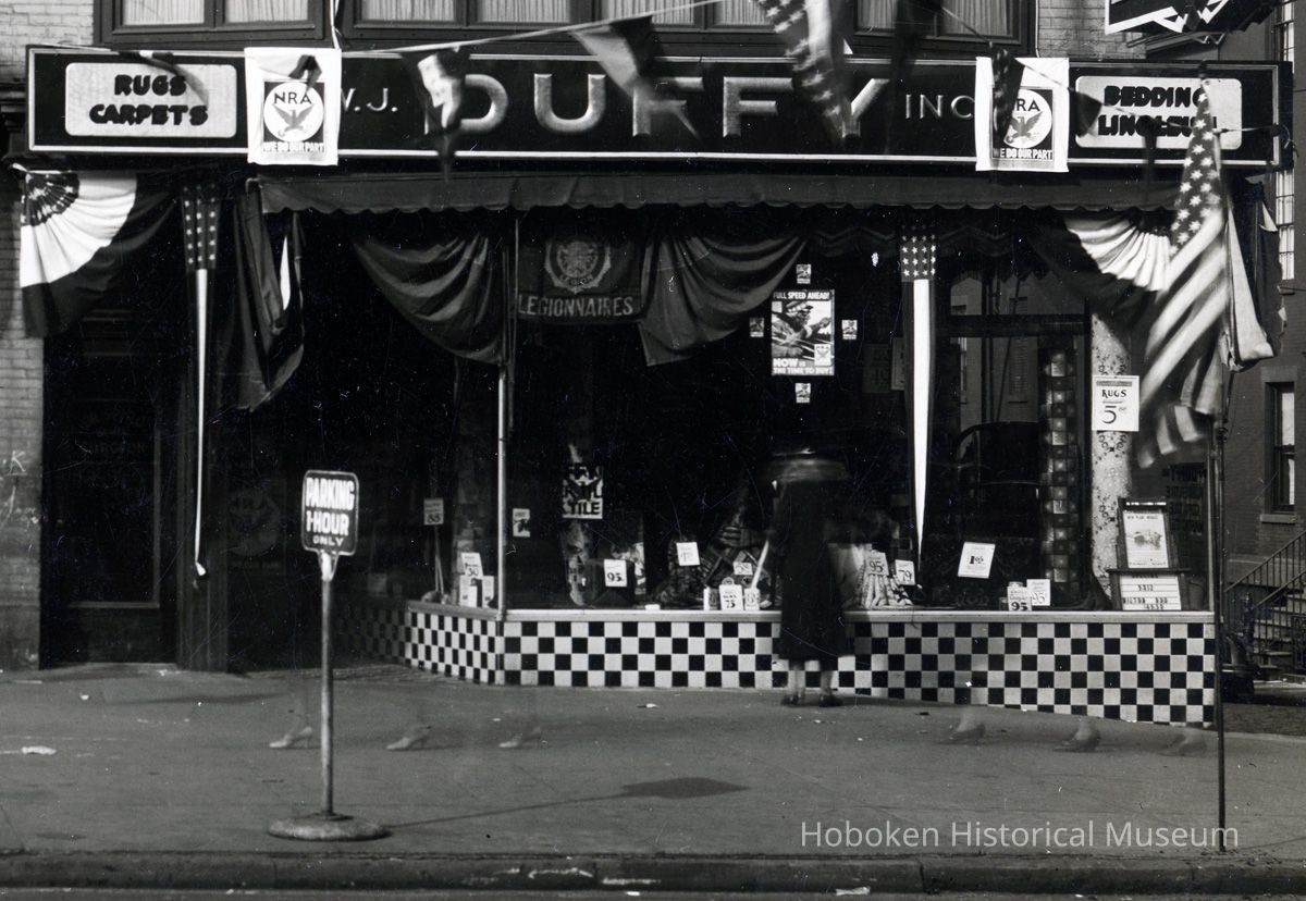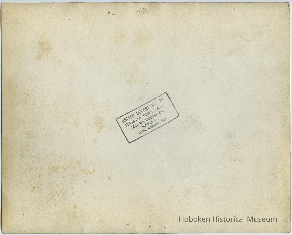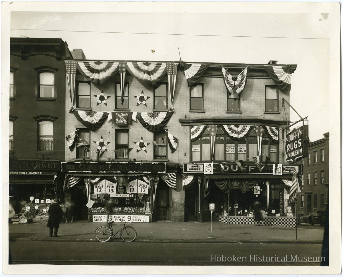 B+W photo of 420 & 422 Washington Street decorated with bunting and swagging by United Decorating Company of Hoboken, Hoboken, n.d., ca. mid-Oct. 1933.