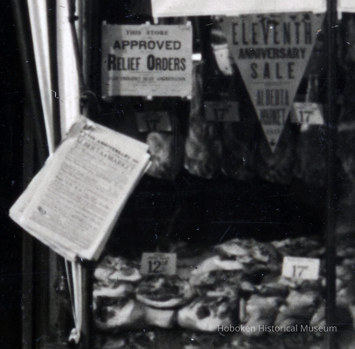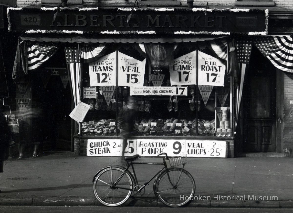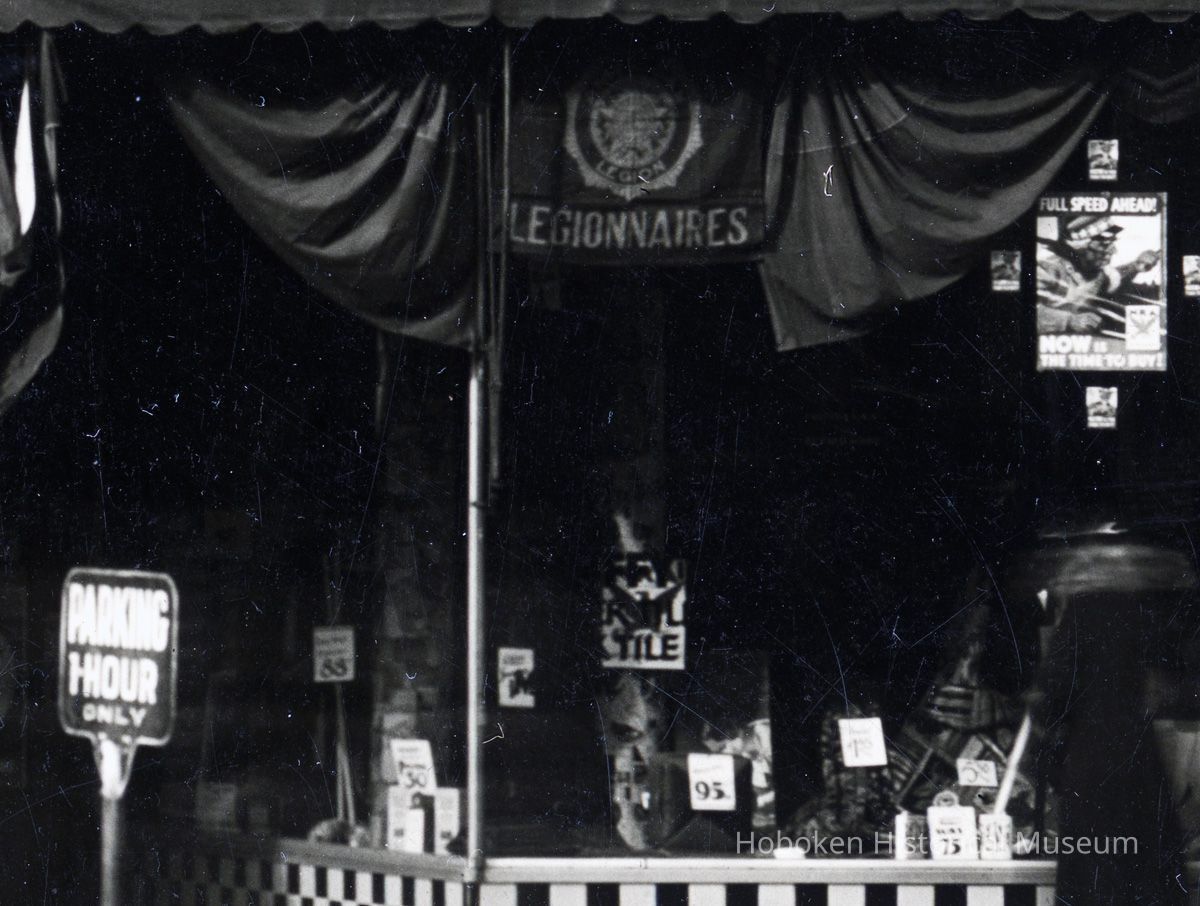 B+W photo of 420 & 422 Washington Street decorated with bunting and swagging by United Decorating Company of Hoboken, Hoboken, n.d., ca. mid-Oct. 1933.