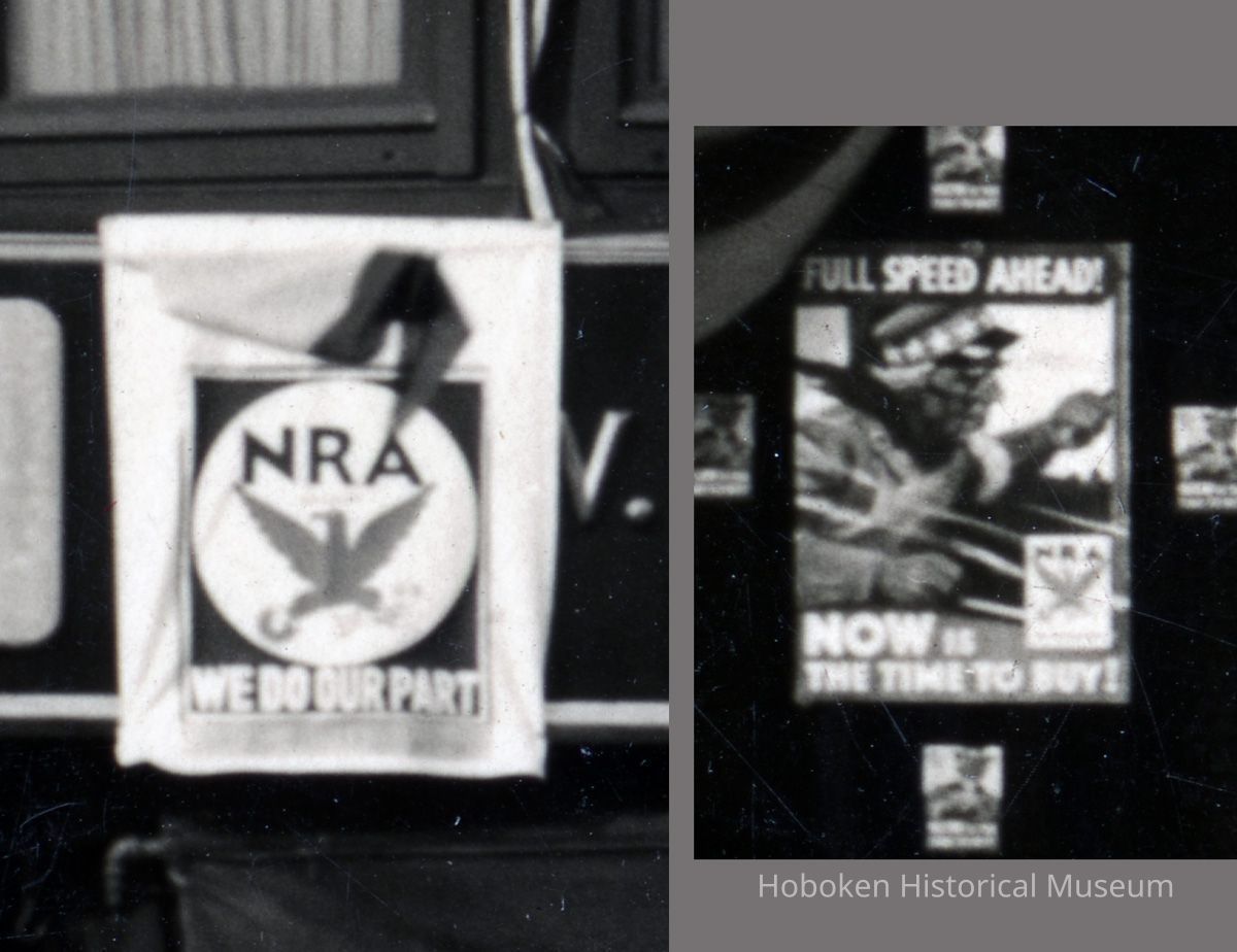 Notes: All detail images are from print 2: Detail 1, left: Alberta Market window with many signs with meats offered and prices; other signs are described in details 2 and 3. Detail 2: Alberta Market window view of signs to right of entrance including "This Store ... Approved ... Relief Orders" and triangular pennant "Eleventh Anniversary Sale." Detail 3: Albert Market, view of signage at center of window including Eleventh Anniversary, partial view of NRA Member sign or banner, and American Legion banner. Detail 4: W.J. Duffy window including moveable sign on stand near curb: Parking 1-Hour Only Detail 5: Duffy window detail views of two types of N.R.A. signage left: NRA We Do Our Part. A fringed cloth sign mounted on the exterior business name sign right: NRA Full Speed Ahead. Now Is The Time To Buy. Printed sign mounted inside window. (Other examples of this sign have been seen with copyright 1933, Einson-Freeman Co., Inc, Long Island, N.Y.) Detail 6: Duffy window detail to right of entrance with American Legion / Legionnaires sign / banner; parking sign; NRA Full Speed Ahead sign. Detail 7: Duffy window, lower right - newspaper page display, with only the banner text legible: Last Minute Photo; New Plane Menace; Sunday News. While no date can be read, it is likely that this article is about the October 10, 1933 passenger airplane crash that was apparently caused by a bomb aboard it. It is generally considered as the first such crash attributed to a terrorist act and the crime has never been solved. ==== ==== Original or Copy: Original Status: OK Status By: dw Status Date: 2015-03-23
