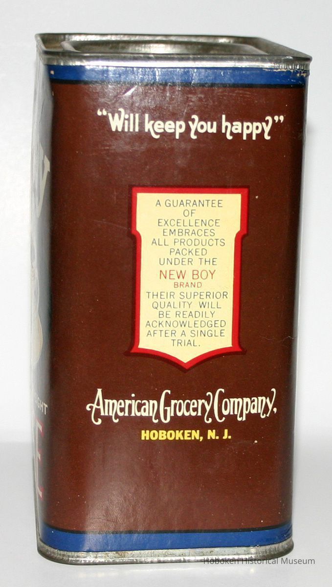 Container: New Boy Coffee, one pound. American Grocery Company, Hoboken, N.J., no date, circa 1925-1935. Rectangular metal carton with plain metal top and bottom; printed paper label on all sides except seam; 6" high x 4-5/8" wide x 3-1/8" deep; pry-out oblong lid.