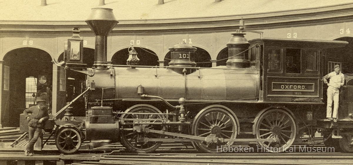 Sepia tone photograph of Delaware, Lackawanna & Western Railroad, Morris & Essex Division locomotive 101, "Oxford", outside roundhouse, Hoboken, April 10, 1886.