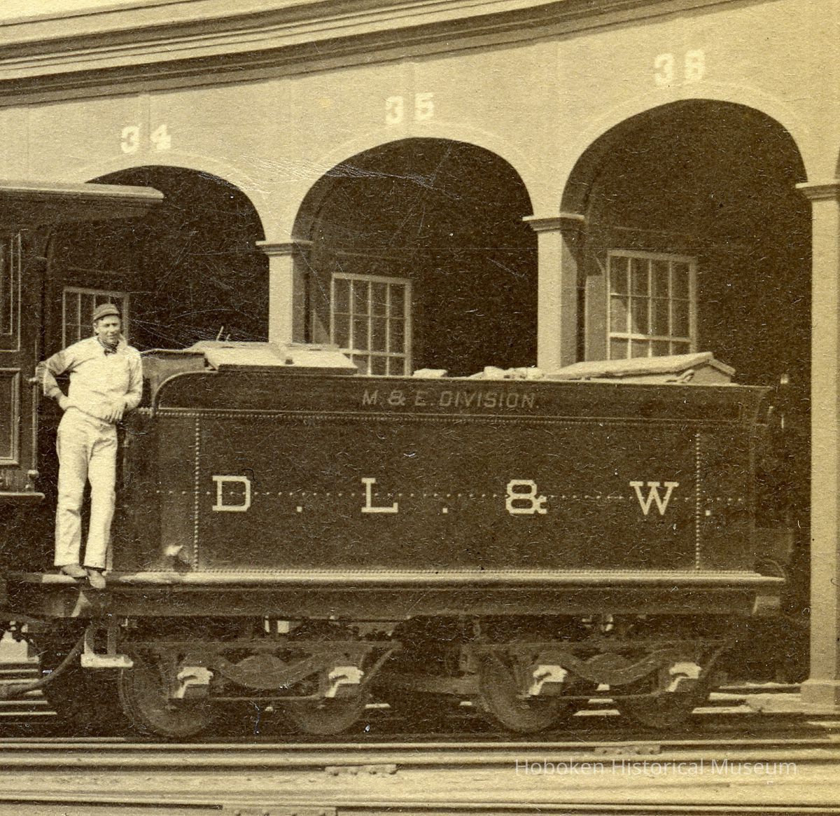 Sepia tone photo of Delaware, Lackawanna & Western R.R., M. & E. Div. locomotive 101, "Oxford", outside roundhouse, Hoboken, Apr.10, 1886.