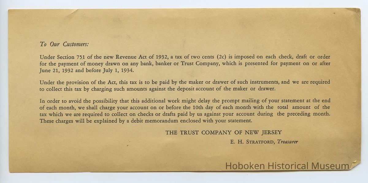 Enclosure explains 2 cent tax from June 21, 1932 to July 1, 1934 on each check, draft or money order for payment; discusses billing method used by the bank.