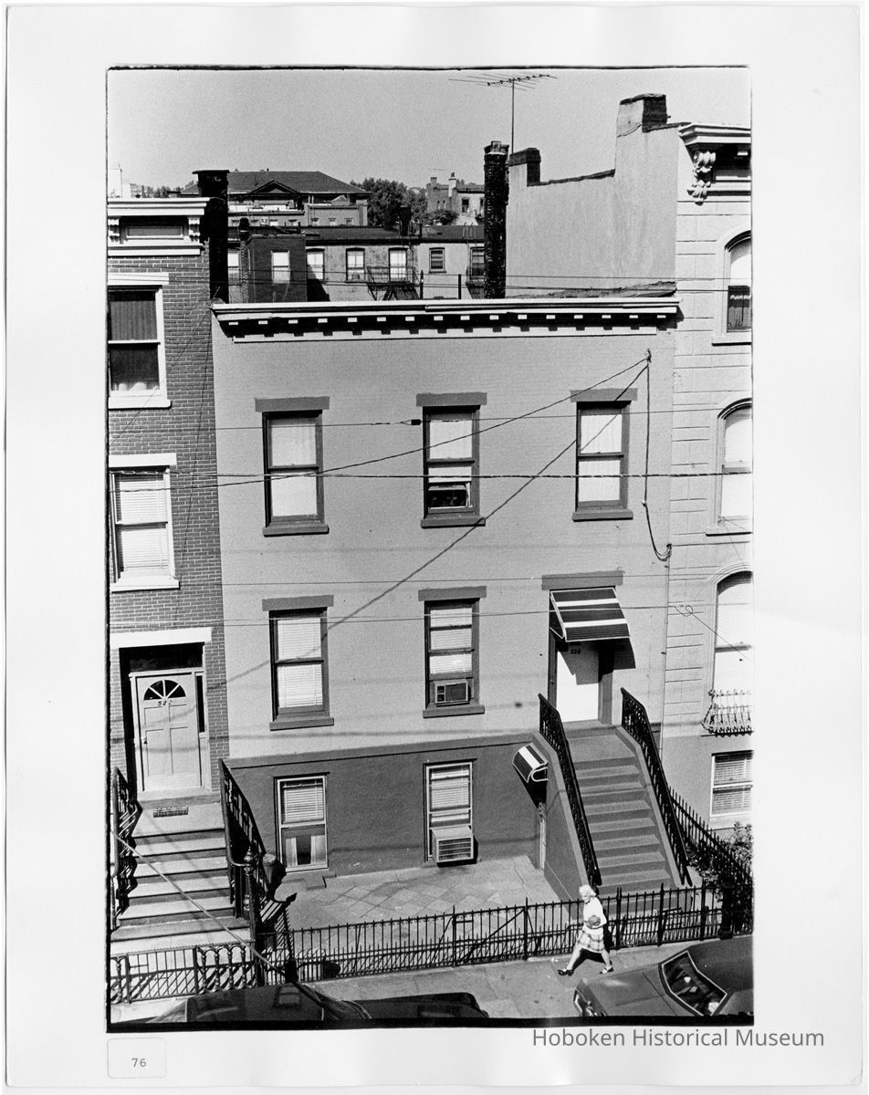 Black-and-white photo of the exterior of nos. 522 & 524 of an unidentified street, Hoboken, N.J., no date (ca. 1968-1972). Photo was probably taken by William Tremper. 8-5/16" wide x 12-7/16" high image on 11" x 14" paper. Adhesive label attached at the lower right border with the number "76" typed. Reverse has holographic pencil notations at the top edge; see image. The woman in the image is not identified.