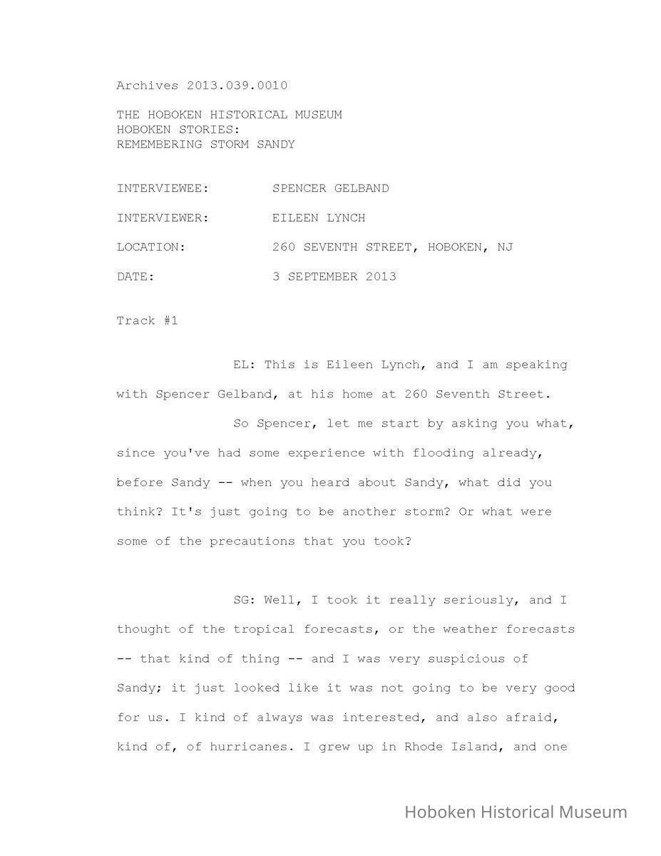 Oral History Interview: Spencer Gelband, Sept. 3, 2013. Hoboken Stories: Remembering Storm Sandy.