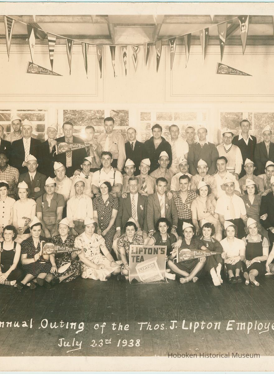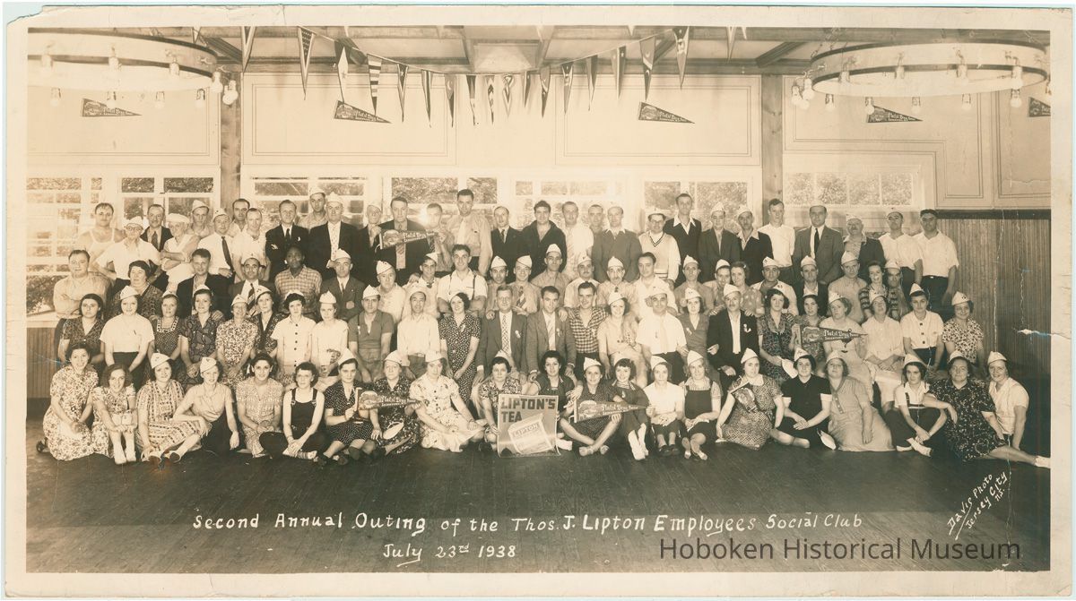 Sepia-tone group photo of the Second Annual Outing of the Thomas J. Lipton Employees Social Club, Ladentown, N.Y., July 23, 1938. 10-1/8" high x 18-1/8" long. Caption and photo credit in image. Reverse is blank. None of the people are identified.