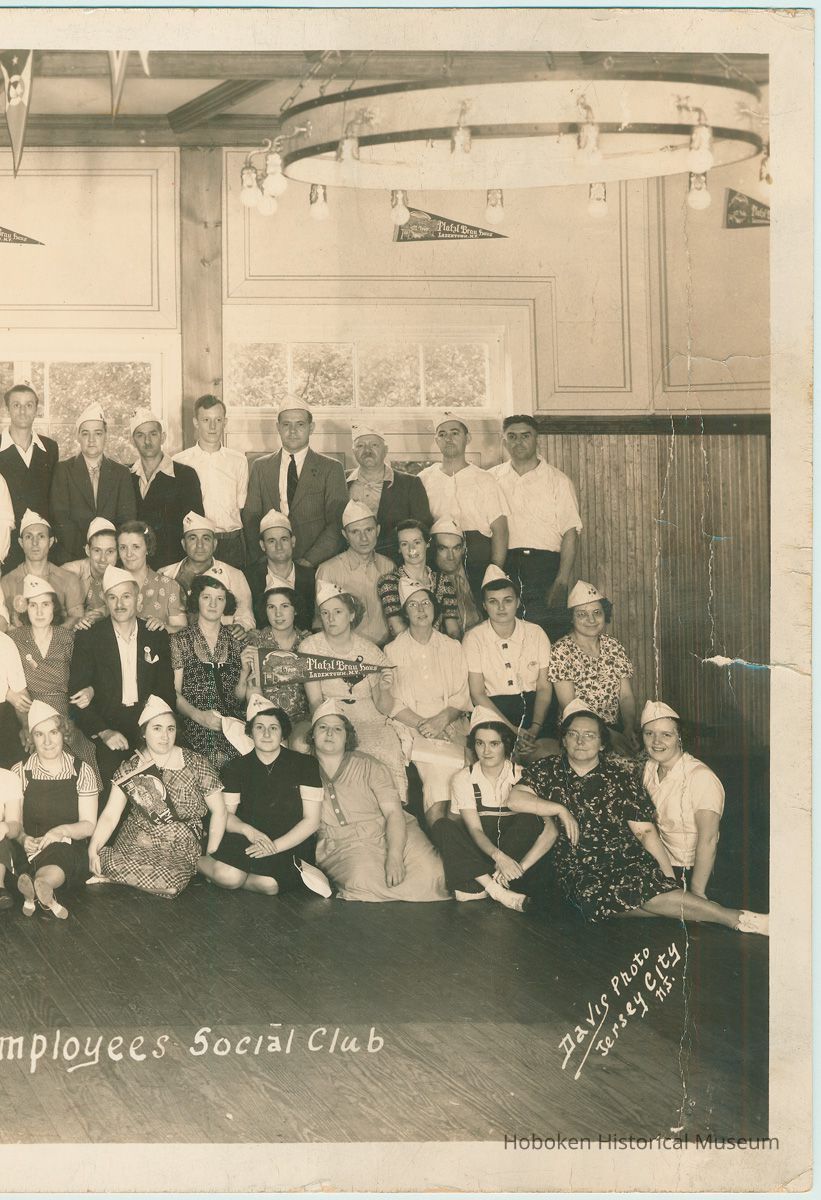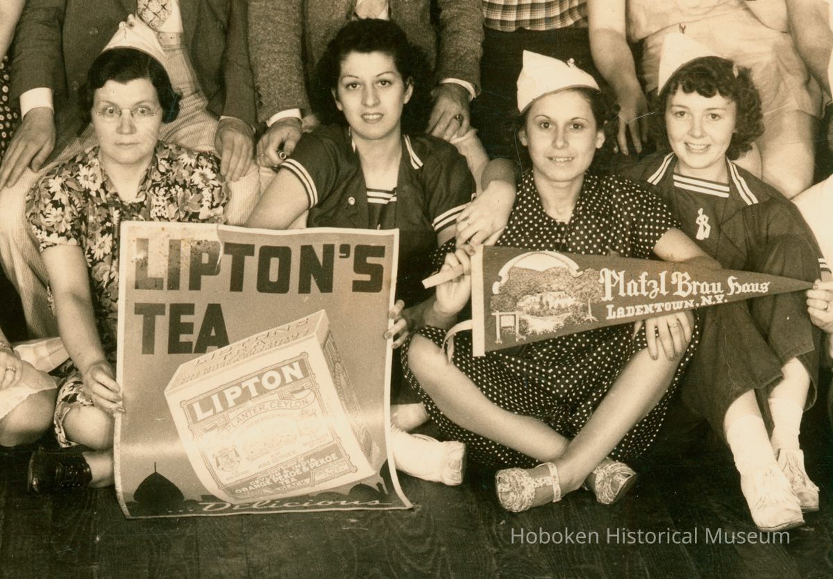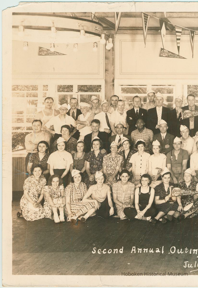 The Lipton Tea Company was based in Hoboken in a building at approximately 15th & Washington Sts. (It was converted to rental apartments in the 1990's.) Of the 97 people in the group, 41 are women. The site of this outing was the Platzl Brau Haus in Ladentown as seen on the many decorative felt pennants on the walls and that some people are holding.