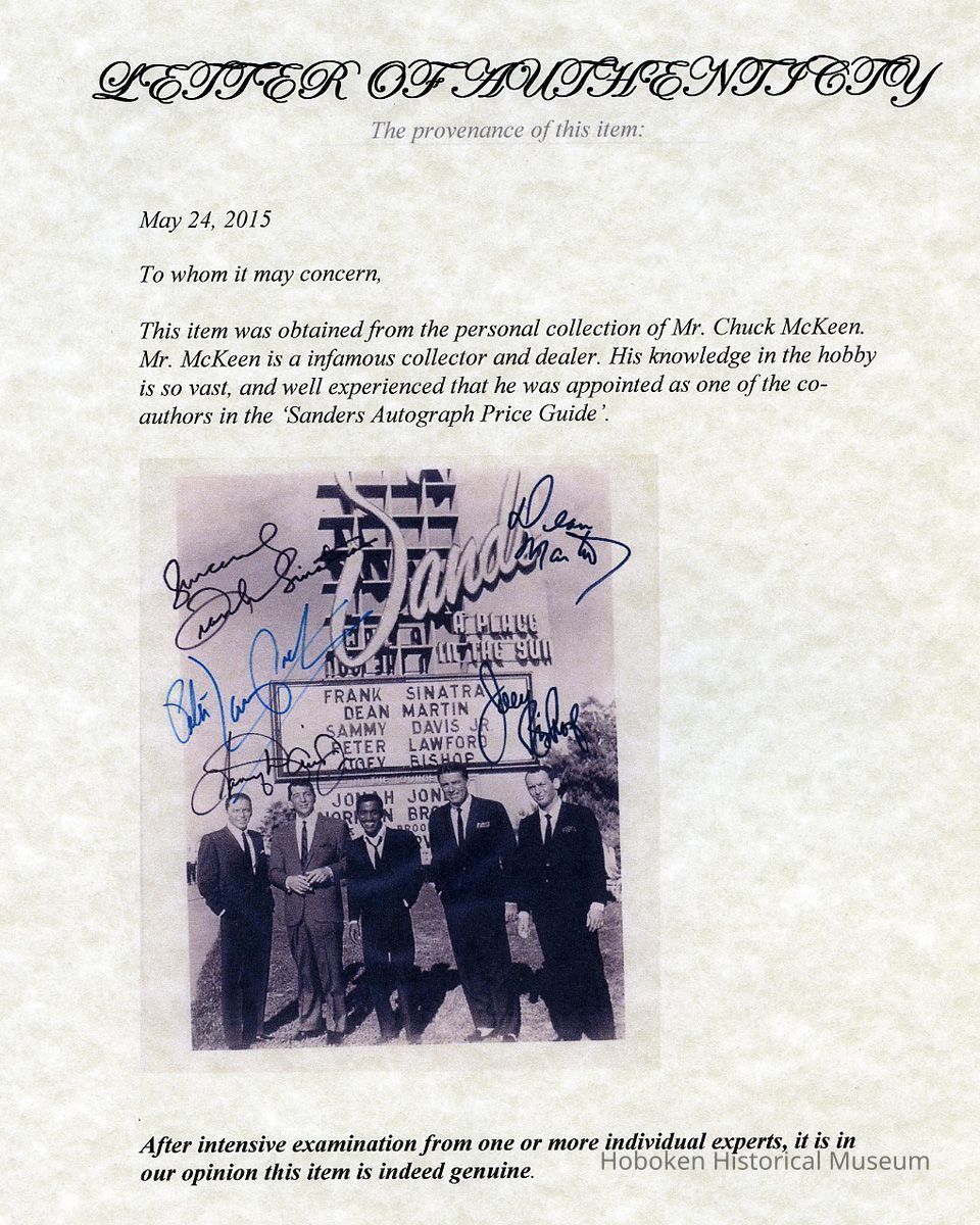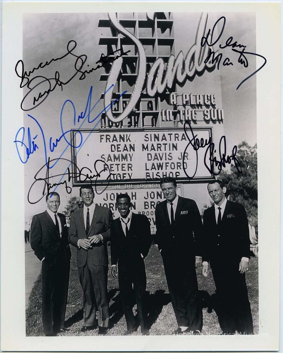 B+W photo of Frank Sinatra & 4 other Rat Pack members posed outside Sands marquee sign, Las Vegas, NV, ca. Jan. 1960; reputedly signed by all.