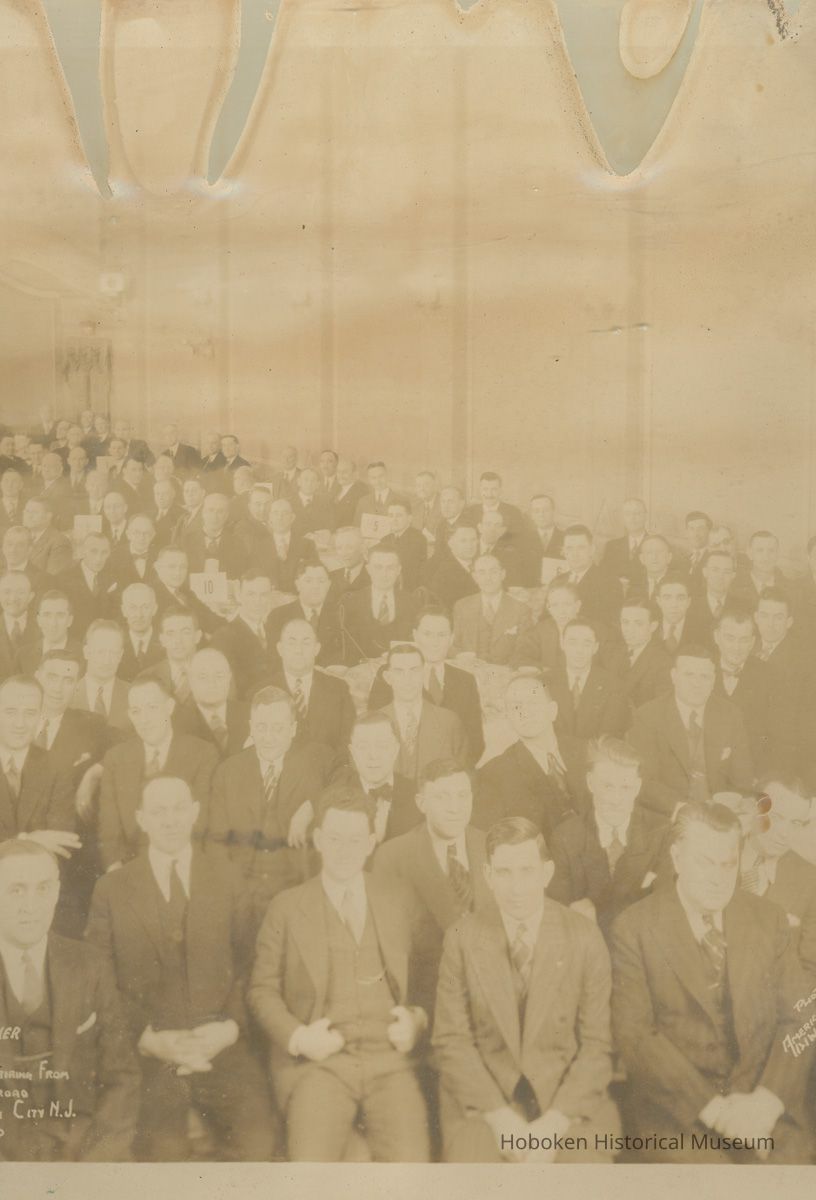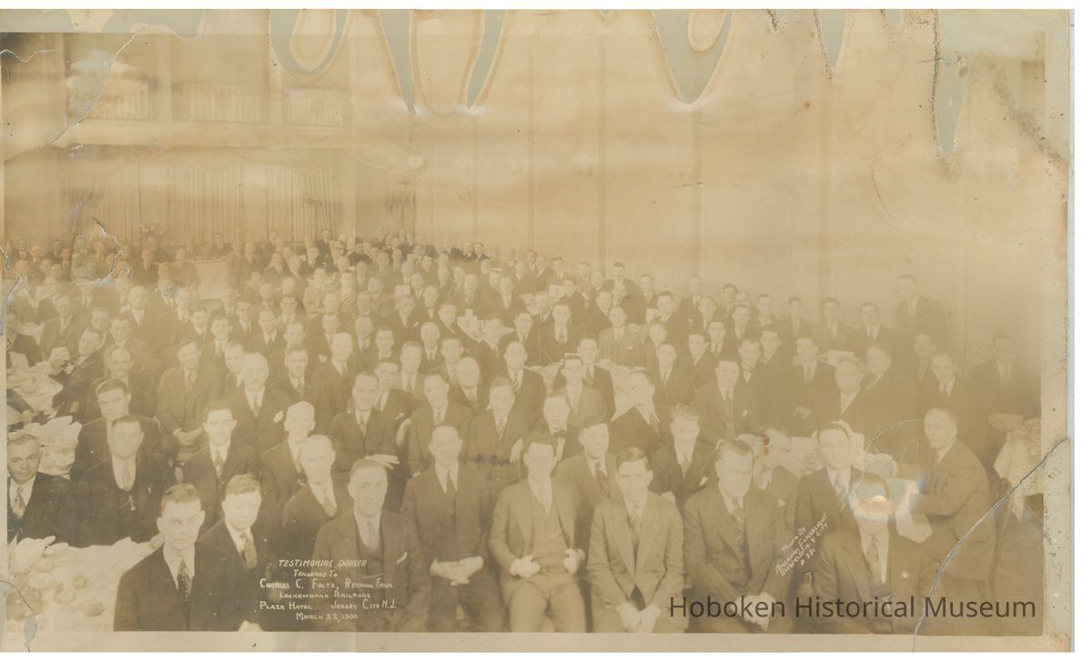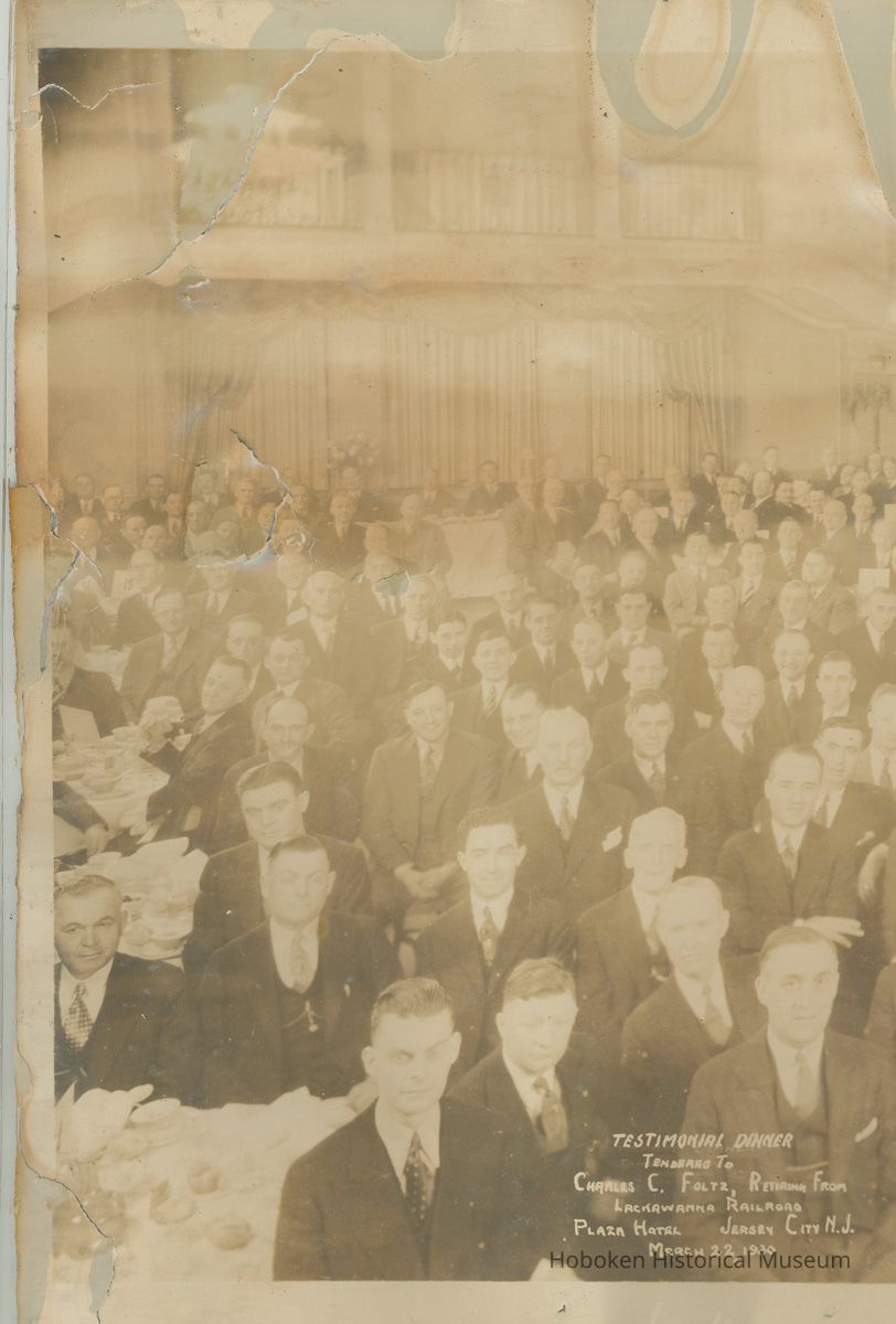 Sepia-tone group photo of the testimonial dinner for Charles C. Foltz at the Plaza Hotel, Jersey City, N.J., March 22, 1930. 12" x 20" wide print. Captioned in image. Reverse is blank. Photograph taken by American Flashlight, New York, New York. Job or negative no. 281.