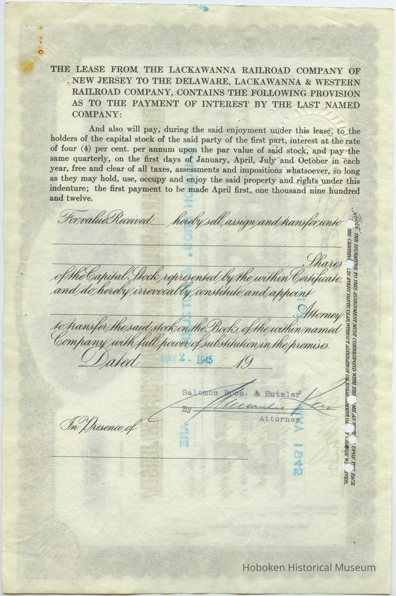 Stock certificate: The Lackawanna Railroad Company of New Jersey; 100 shares of Capital Stock issued to Salomon Bros. & Hutzler, May 1, 1945.