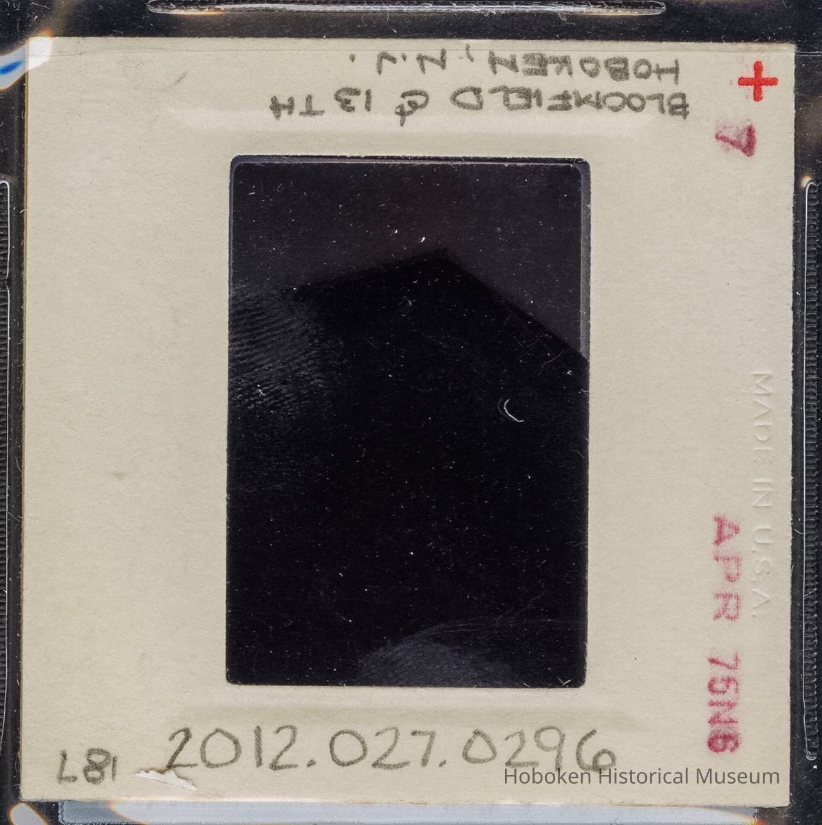 Color slide of detail view of cornice, pediment, dentils and frieze at 1305 Bloomfield on the NE corner with 13th