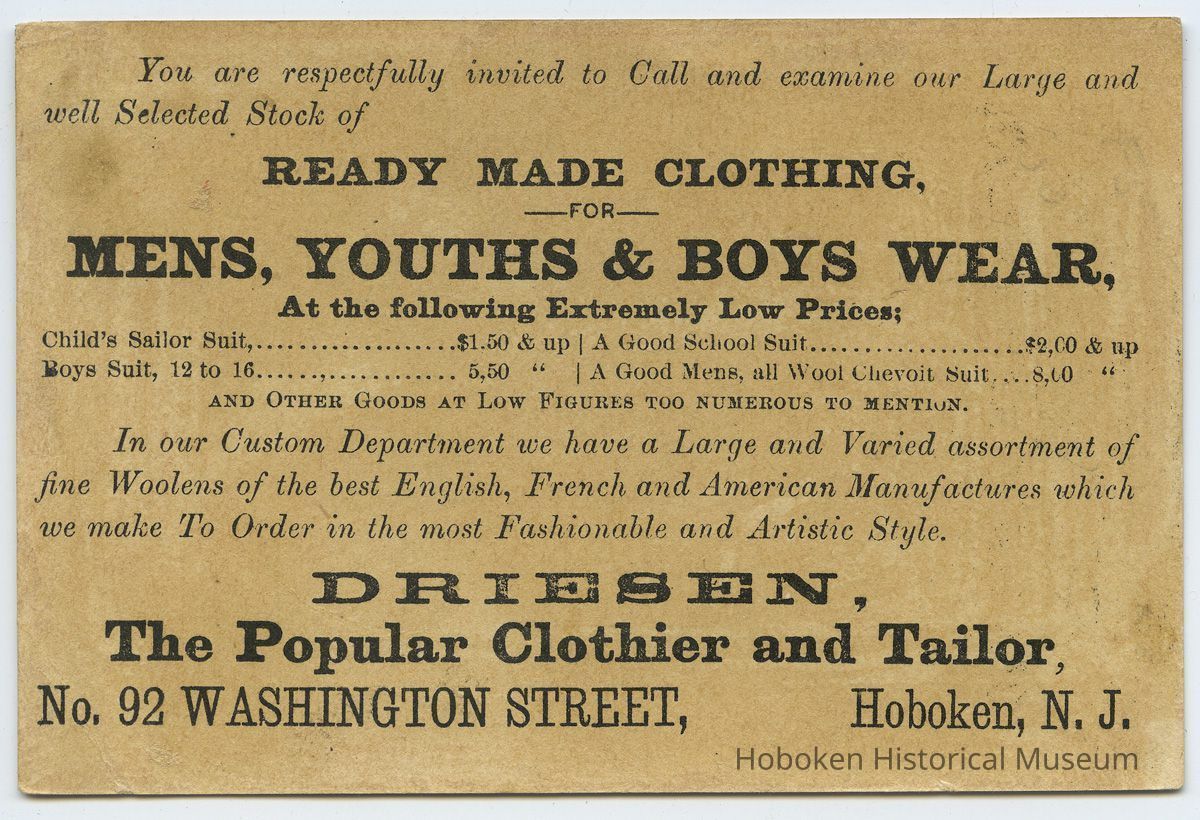 Trade card: Driesen, The Popular Clothier and Tailor, No. 92 (old number) Washington St., Hoboken, N.J. No date, circa 1880-1892.