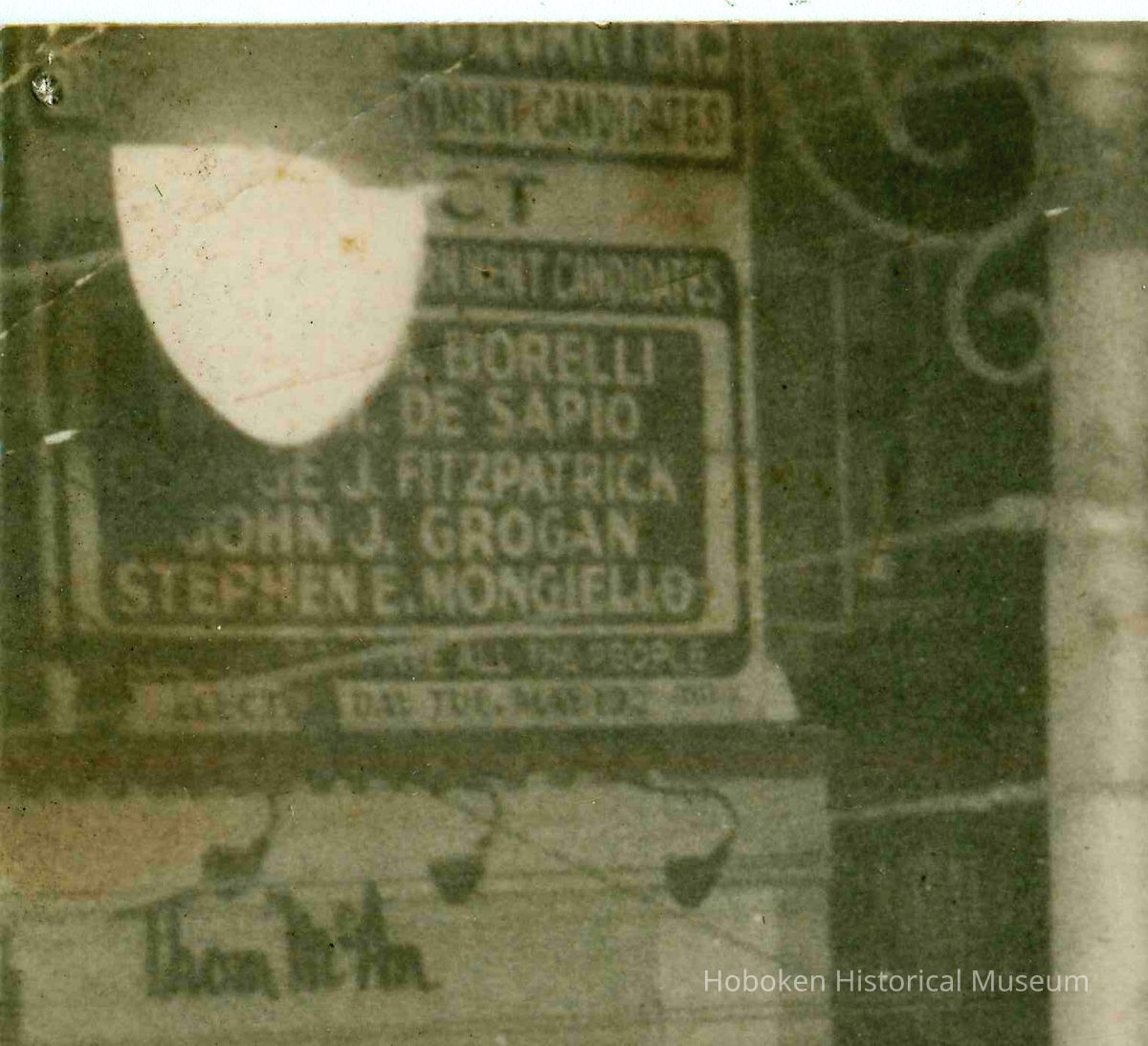 The view is from an elevated position just south of 1st Street looking north. The street sign and an arrow sign are on a pole at the left. At the top left above the Thom McAn shoe store sign (108 Washington St.) is the Headquarters sign for the Good Government Candidates: Borelli, De Sapio, George J. Fitzpatrick, John J. Grogan, Stephen E. Mongiello.