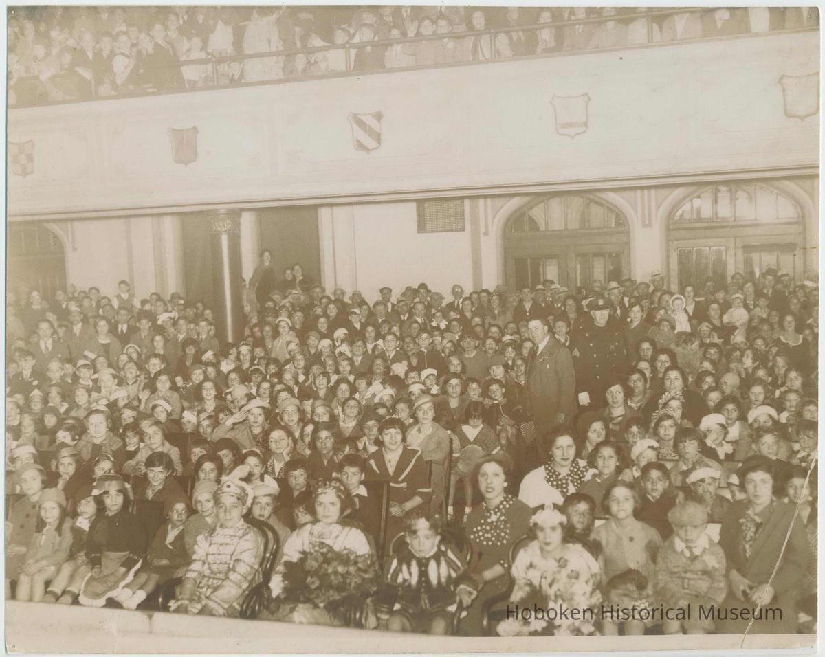 Color copy photo of a sepia-tone photo of an assembly in the Connor's School auditorium, Hoboken, no date, ca. 1945-1950. 8" x 10" wide print. Reverse is blank. Photographer is unknown. None of the individuals are identified.
