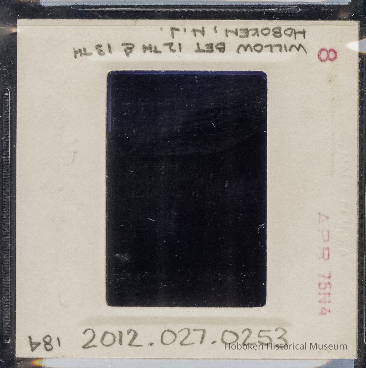 Color slide of detail view of cornices, friezes, dentils and fire escapes on two buildings on the E side of Willow between 12th and 13th