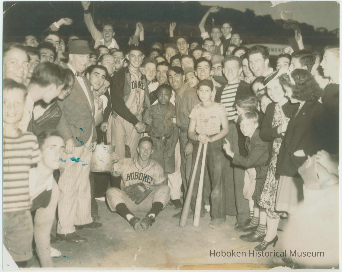 Men, women and children are posed outdoors late in the day for this shot with 2 players in uniform at the center. The high-school-age player standing at the center is shaking hands with an African-American boy that is about 8-10 years old. He appears to be in a uniform, possibly a boy scout uniform. One player is seated on the ground wearing his baseball glove; a boy to his left is leaning on two bats. Whether the Hoboken uniforms are that of Demarest High School (Hoboken's high school at that time) or from some other locally sponsored league team is not known. A school bus is apparently in the right upper background