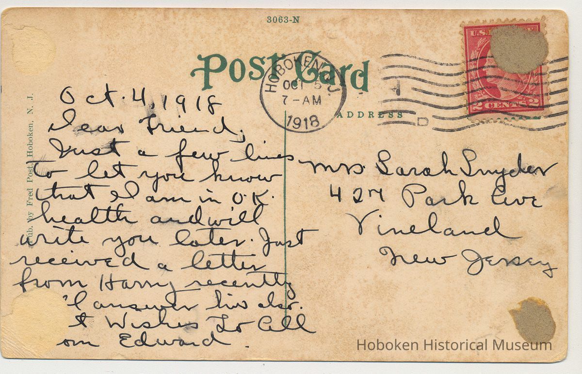 Postcard: U.S. Theatre, Hoboken, N.J. Postmarked Oct. 5, 1918.