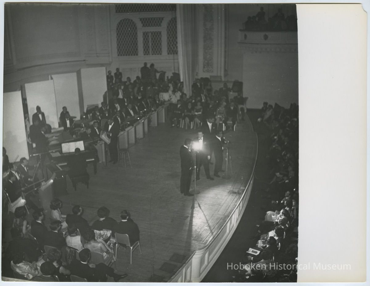 B+W photo of Frank Sinatra, Sammy Davis, Jr., Dean Martin & Jan Murray performing at Carnegie Hall, N.Y., Jan. 27, 1961.
