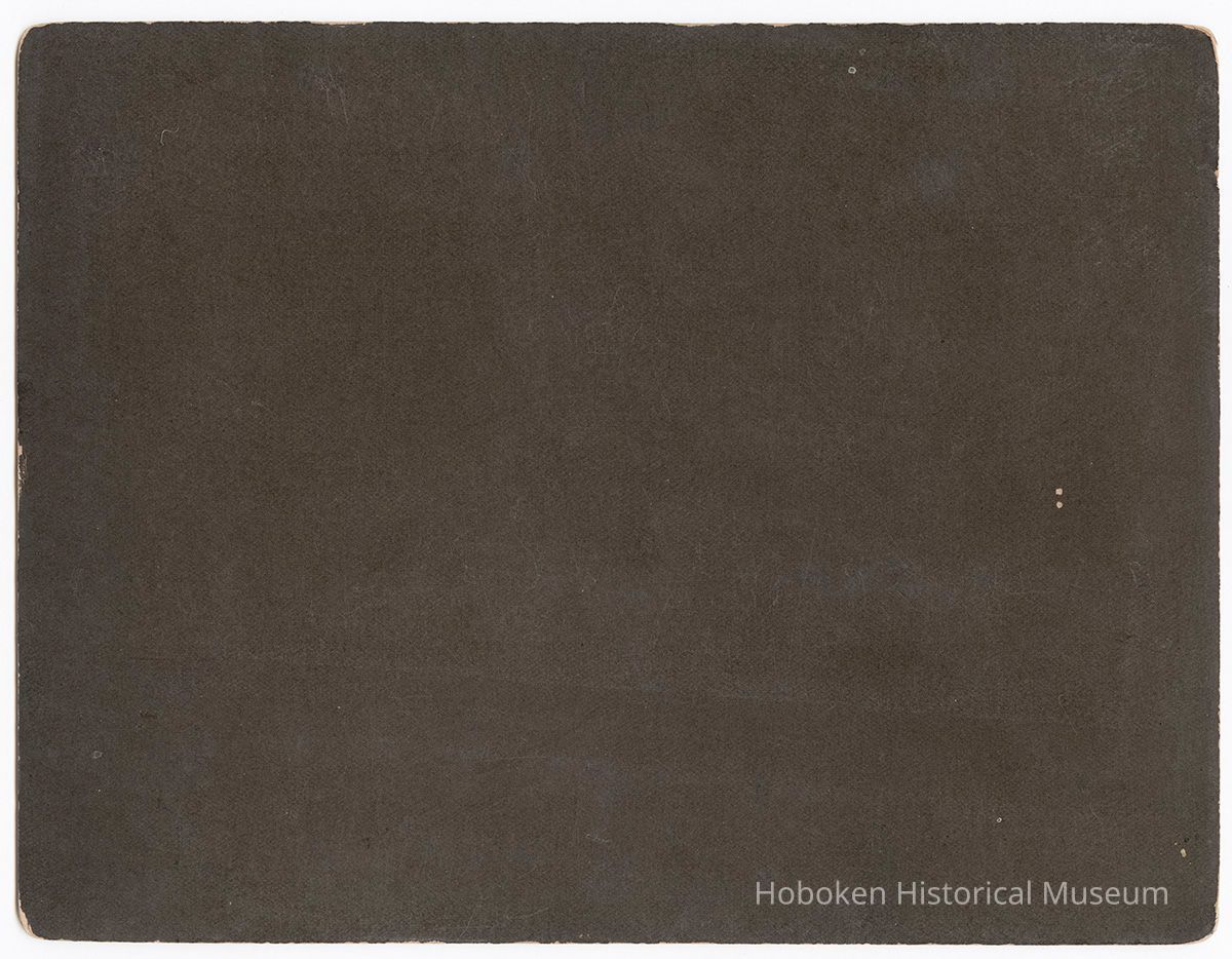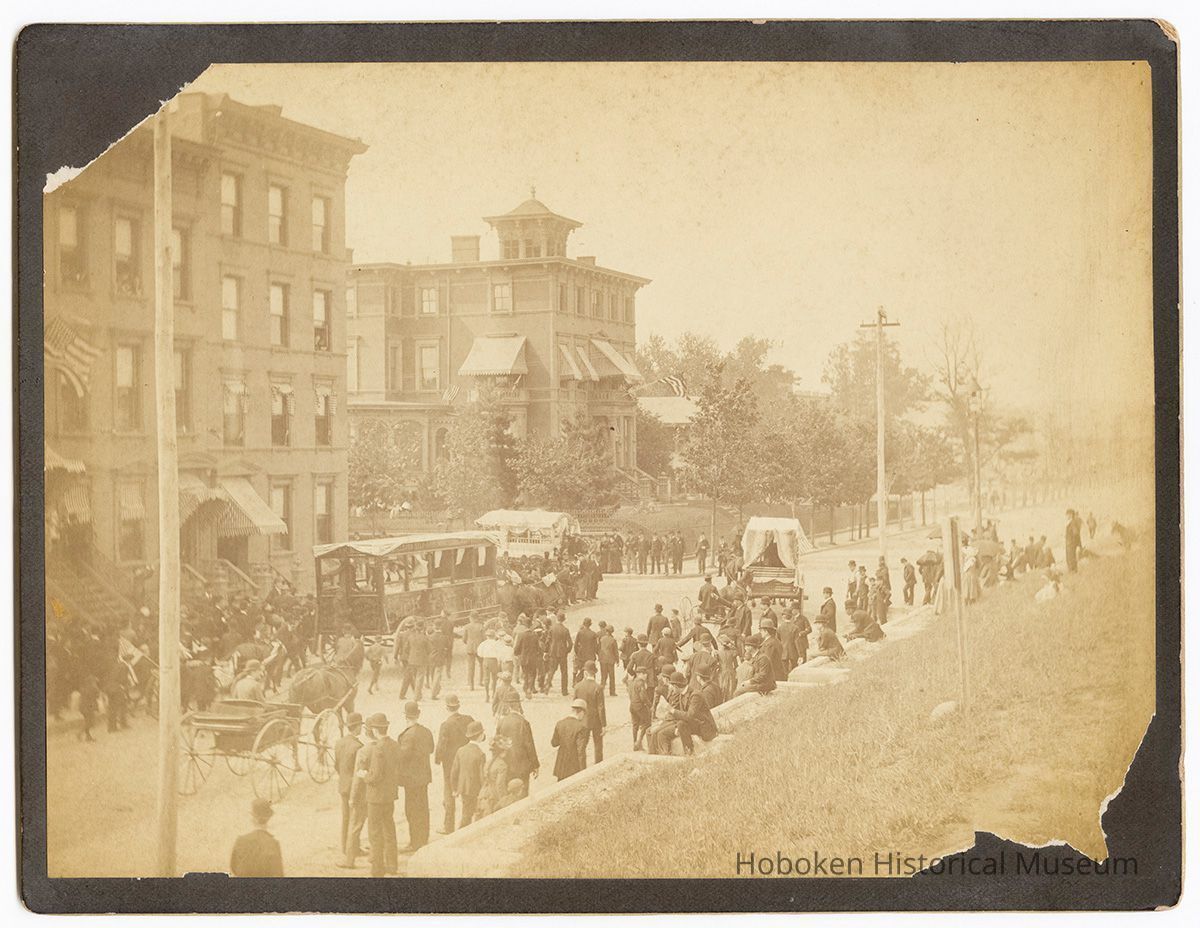 Mounted sepia tone photograph of parade turning off Hudson Street onto 10th Street. Upper left and lower right corners of photo are missing.