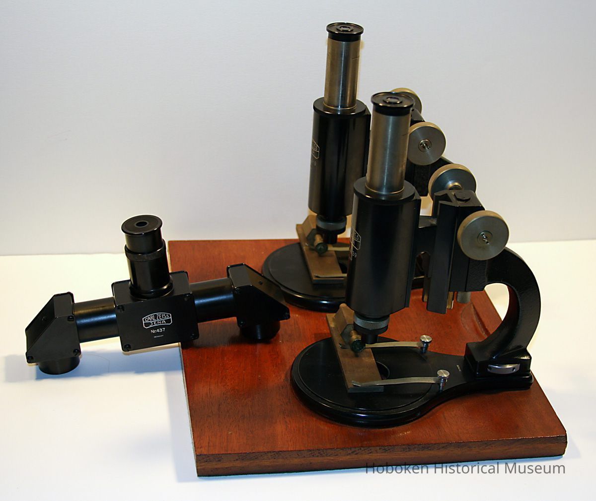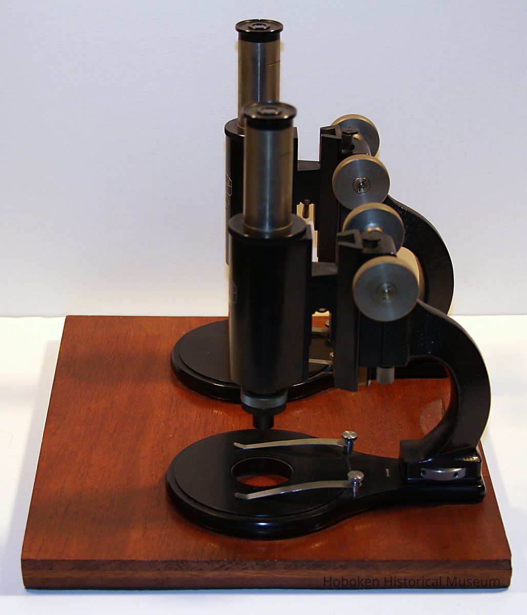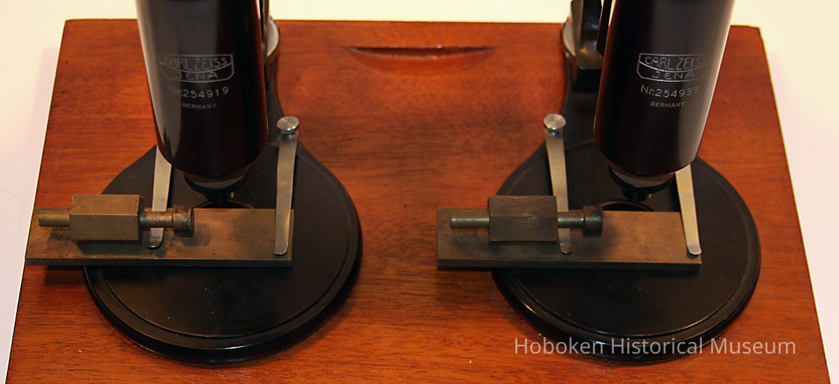 Ballistics comparison microscope formerly owned by the Hoboken Police Department. According to donor, former Police Captain, it was discarded when moving from Hoboken City Hall to One Police Plaza, 1990's. Purchase date not known, but serial numbers place the date of manufacture at circa 1928-1932. Manufactured by Carl Zeiss, Germany. No stock numbers or City of Hoboken identification. Original wood case for mounted unit is lost.