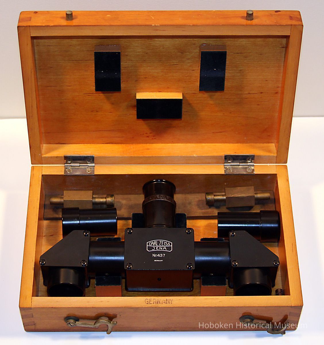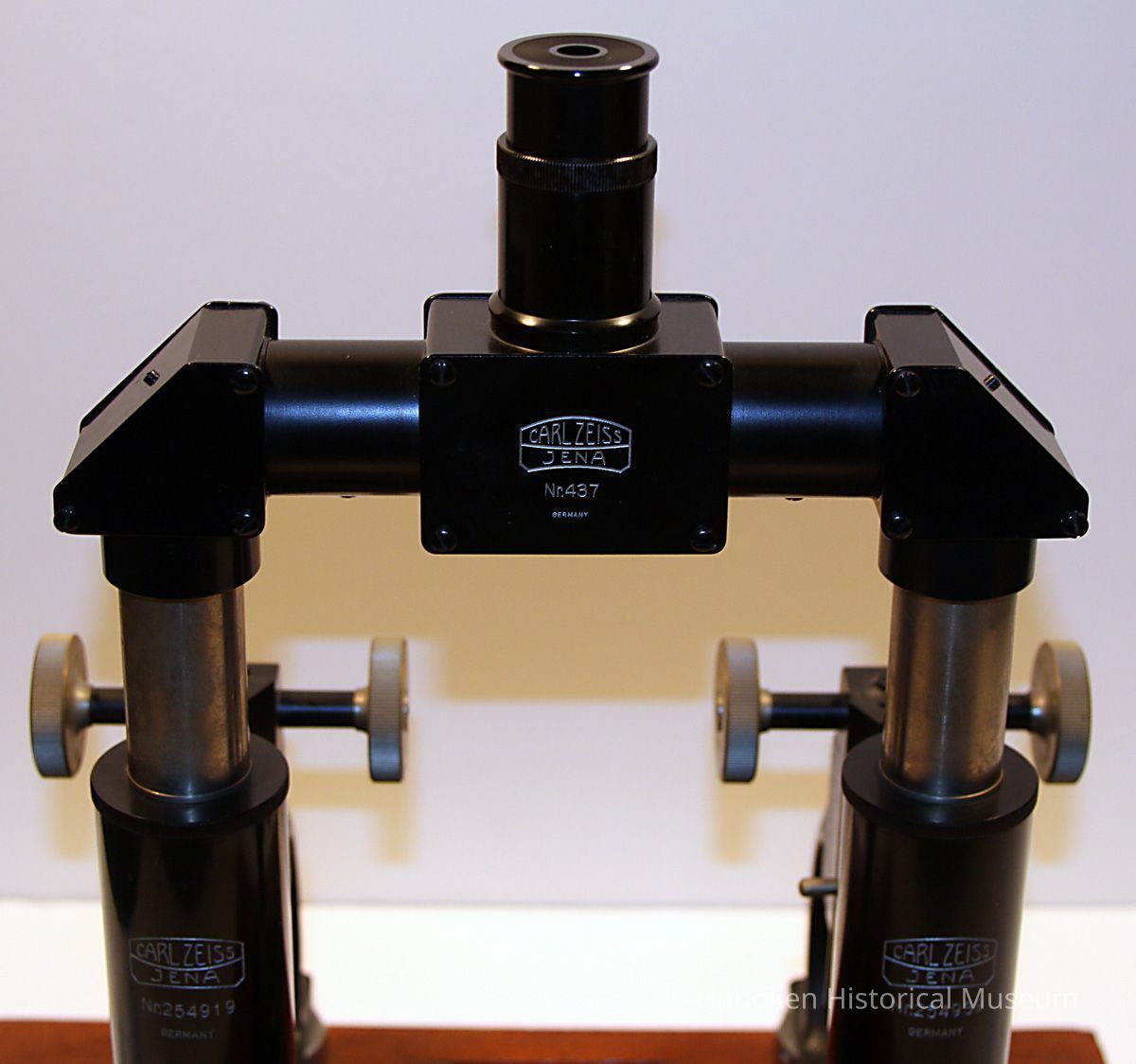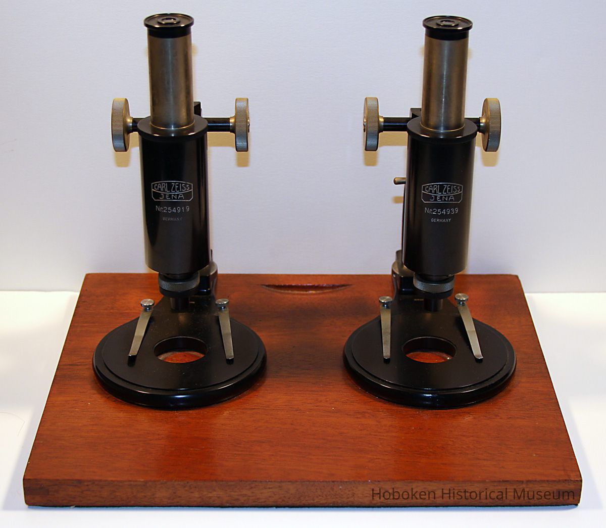 Ballistics comparison microscope formerly owned by the Hoboken Police Department. According to donor, former Police Captain, it was discarded when moving from Hoboken City Hall to One Police Plaza, 1990's. Purchase date not known, but serial numbers place the date of manufacture at circa 1928-1932. Manufactured by Carl Zeiss, Germany. No stock numbers or City of Hoboken identification. Original wood case for mounted unit is lost.
