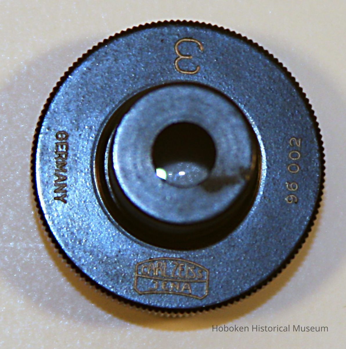 Objective on each microscope is 3 (3x?), Carl Zeiss Jena stock number 96-002. Eyepieces on the individual microscopes are same company, 5x, no stock number. The connecting eyepiece uses prisms for a vertical split view of a bullet placed under each microscope. The eyepiece has no stated magnification; each microscope can be focused with the connecting eyepiece in place.