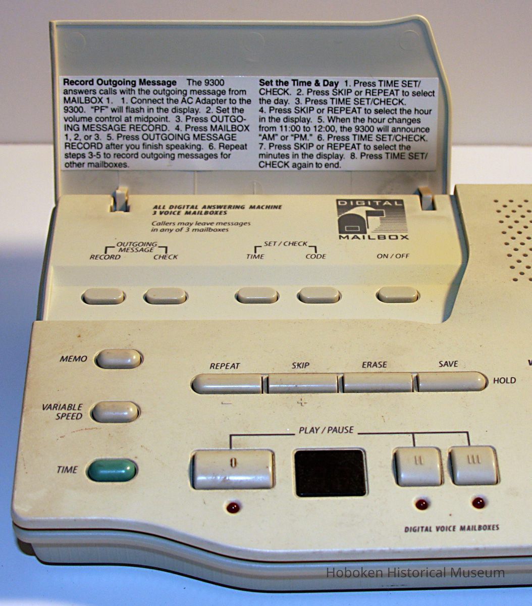 PhoneMate Telephone Answering System, Model 9300; formerly at 732 Willow Avenue, Hoboken from ca. 1995-2007. Beige plastic case, 7-5/8" wide x 5-5/8" deep x 2' high. With AC adaptor power supply. Printed instruction label inside hinged top cover.