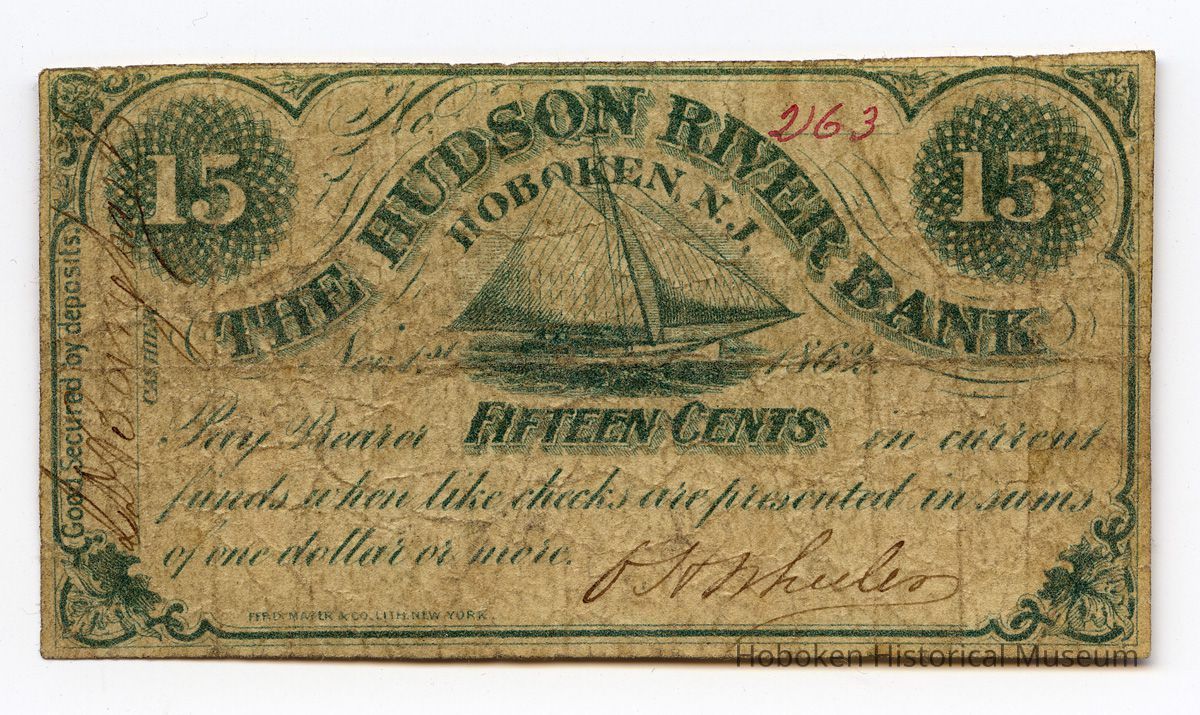 Paper money (fractional scrip): Fifteen cents. The Hudson River Bank, Hoboken, N.J. Nov. 1st 1862. No. 263.