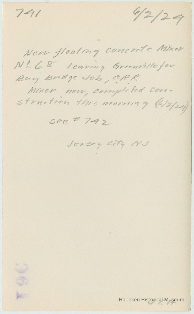 Text on reverse: 741, 6/2/24, New floating concrete mixer no. 68 leaving Greenville for Bay Bridge Job, C.R.R.; Mixer, new , completed construction this morning (6/2/24), see #742, Jersey City, N.J., J.Y.H.