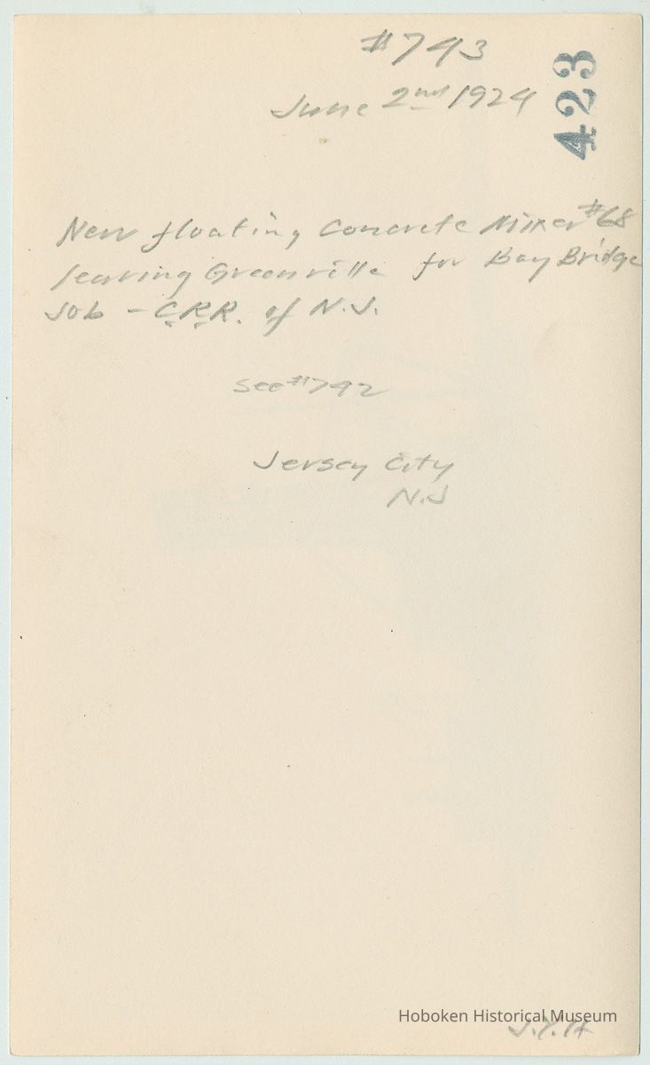 Text on reverse: #743, June 2nd 1924, New floating concrete mixer # 68 leaving Greenville for Bay Bridge Job -C.R.R. of N.J., see #742, Jersey City, N.J., J.Y.H.