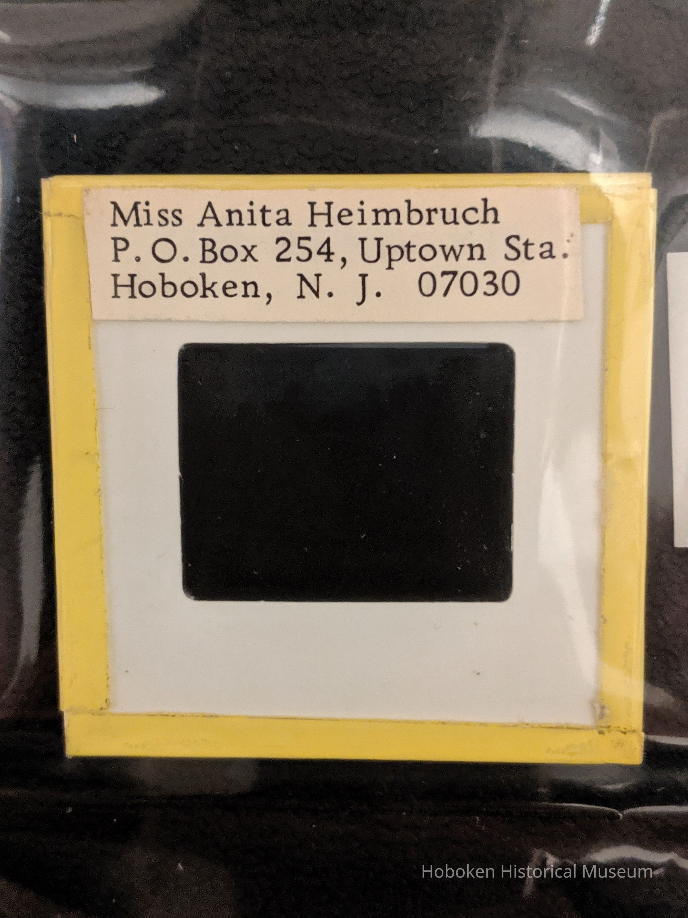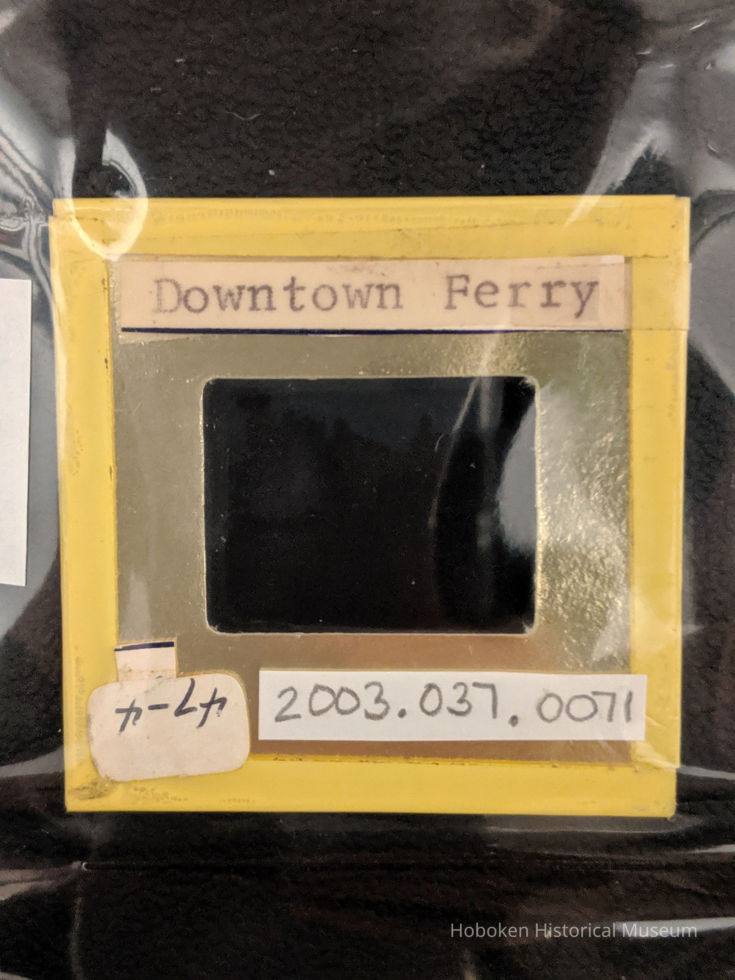 Slide is in a glass mount with photographer's own typewritten label "Downtown Ferry" on the top of the slide, an upsidedown white sticker with "47-4" in the lower left corner, and a typewritten address label on the back top of the slide that reads: