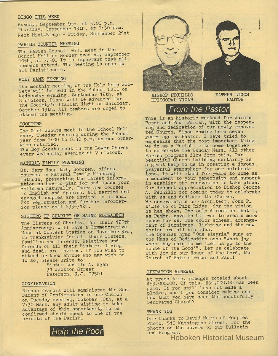 Bulletin, SS. Saints Peter and Paul Church, 404 Hudson St., Hoboken, New Jersey, Sept. 9, 1984.