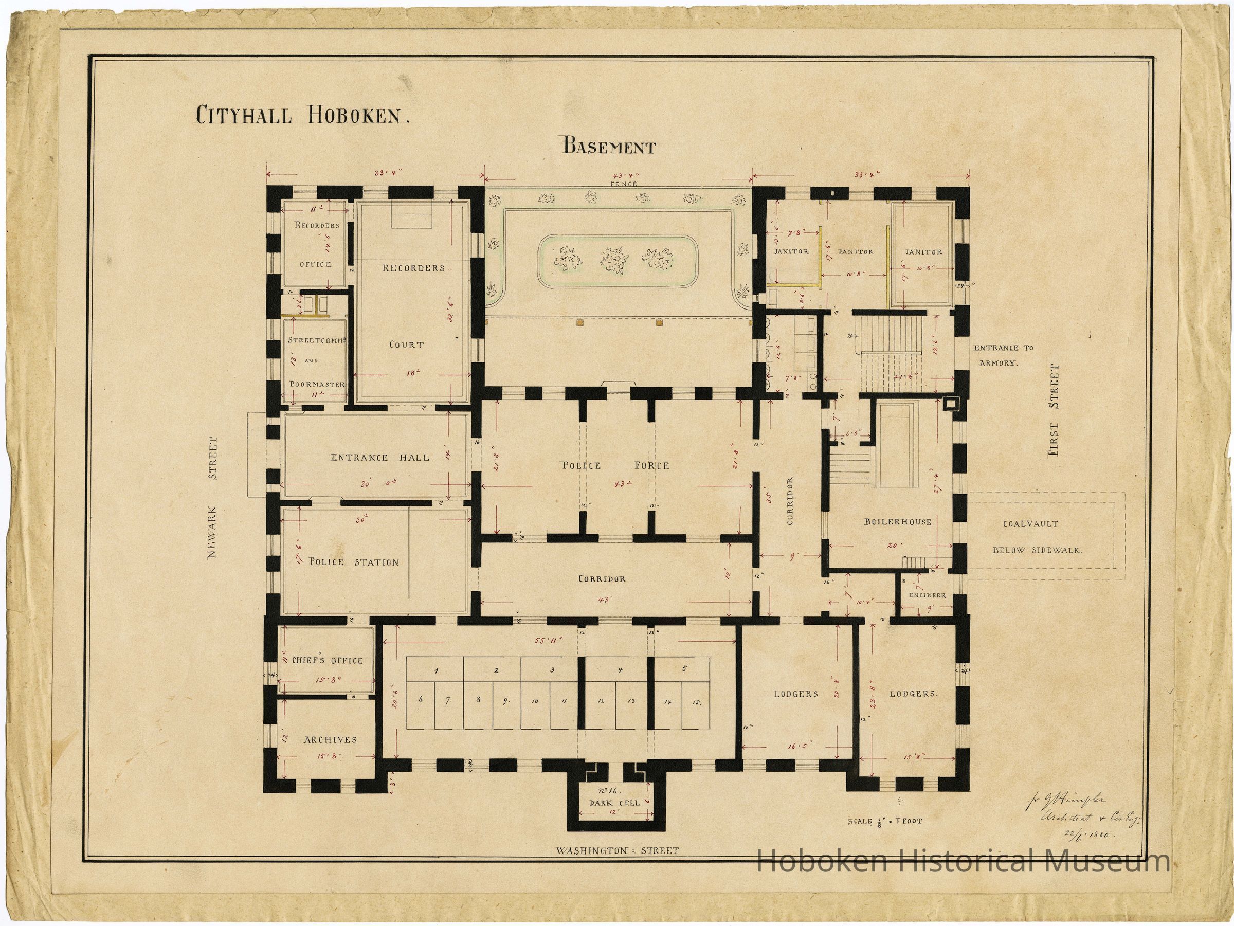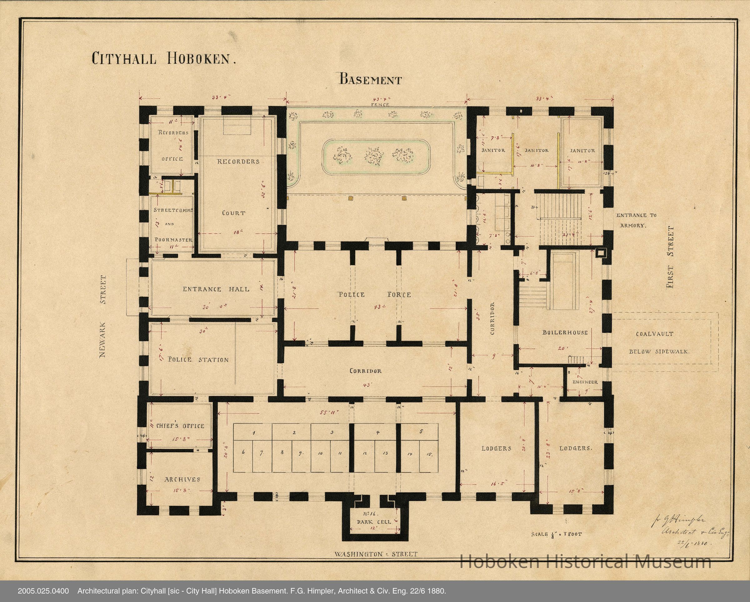 Architectural plan: Cityhall [sic] Hoboken Basement. F.G. Himpler, Architect & Civ. Eng. 22/6 1880.