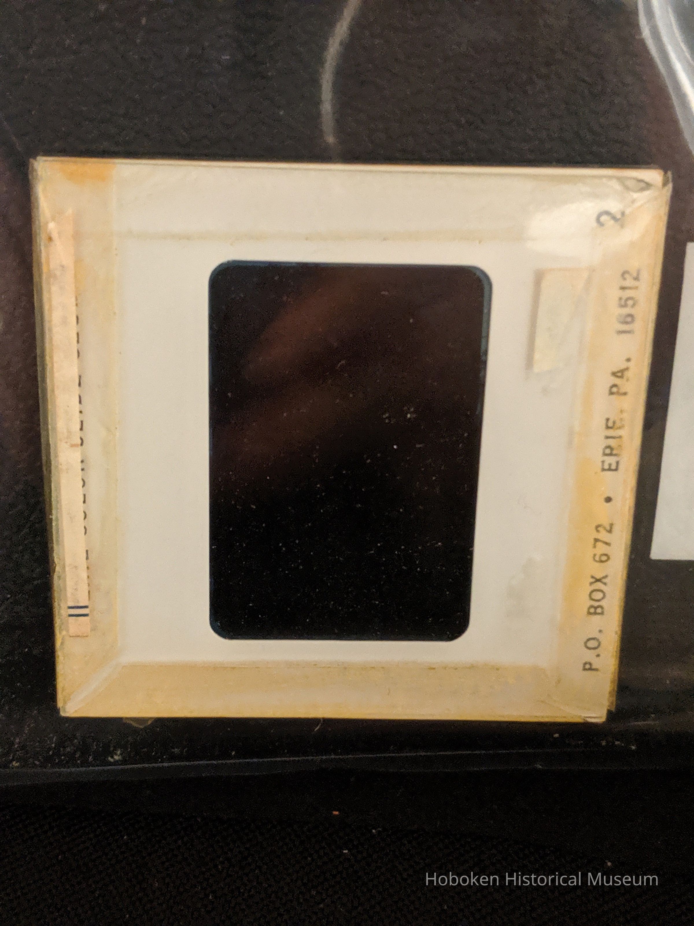 Slide is in a glass mount with blank white sticker in lower left corner. Typewritten label on back top of slide reads "Erie Color Slide Club". Typewritten label on bottom back of slide reads "P.O. BOX 672 ERIE, PA. 16512".