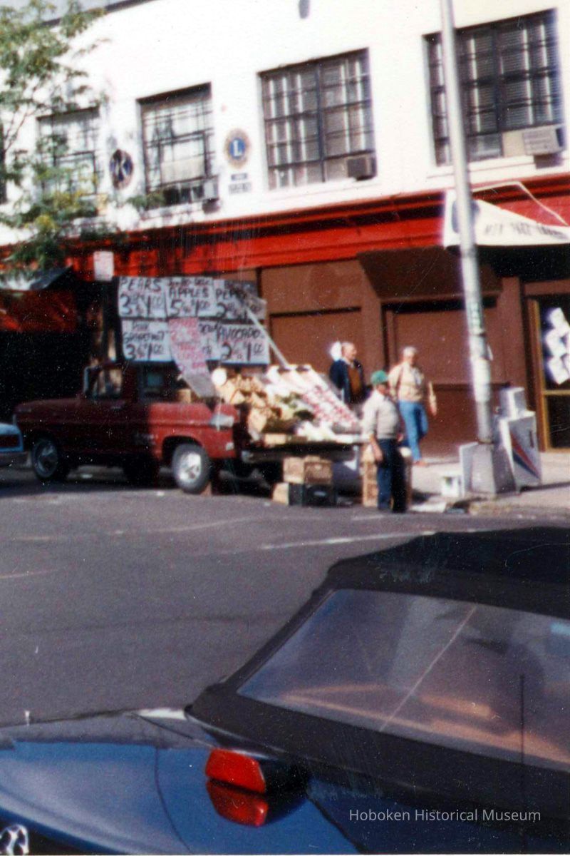 View is northwest. Corner of River & Newark Streets with Clam Broth House in view. Note fruit & vegetable seller with truck at corner.