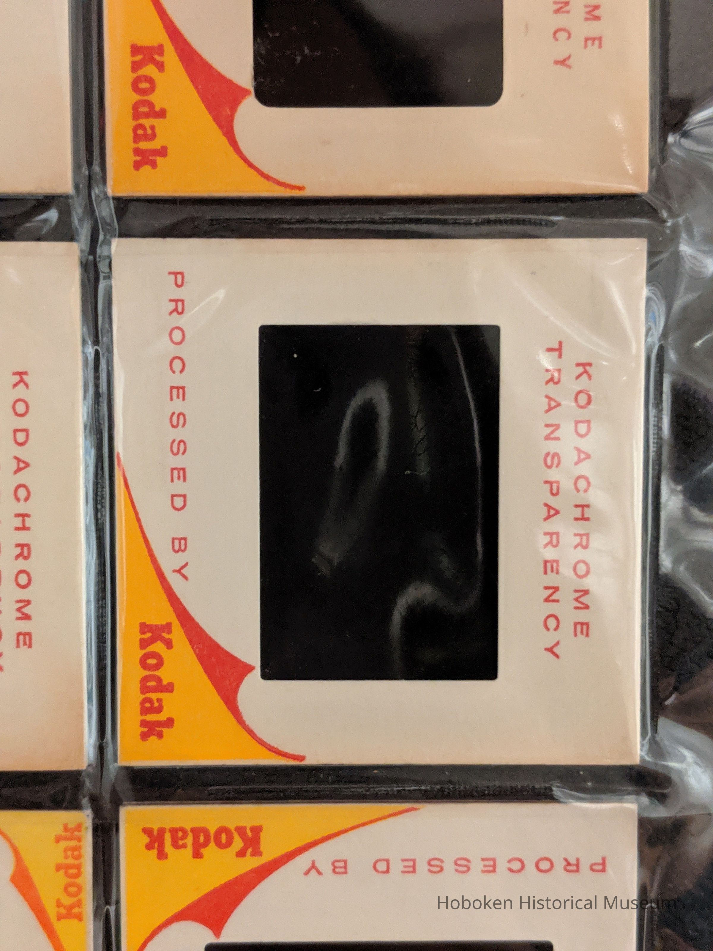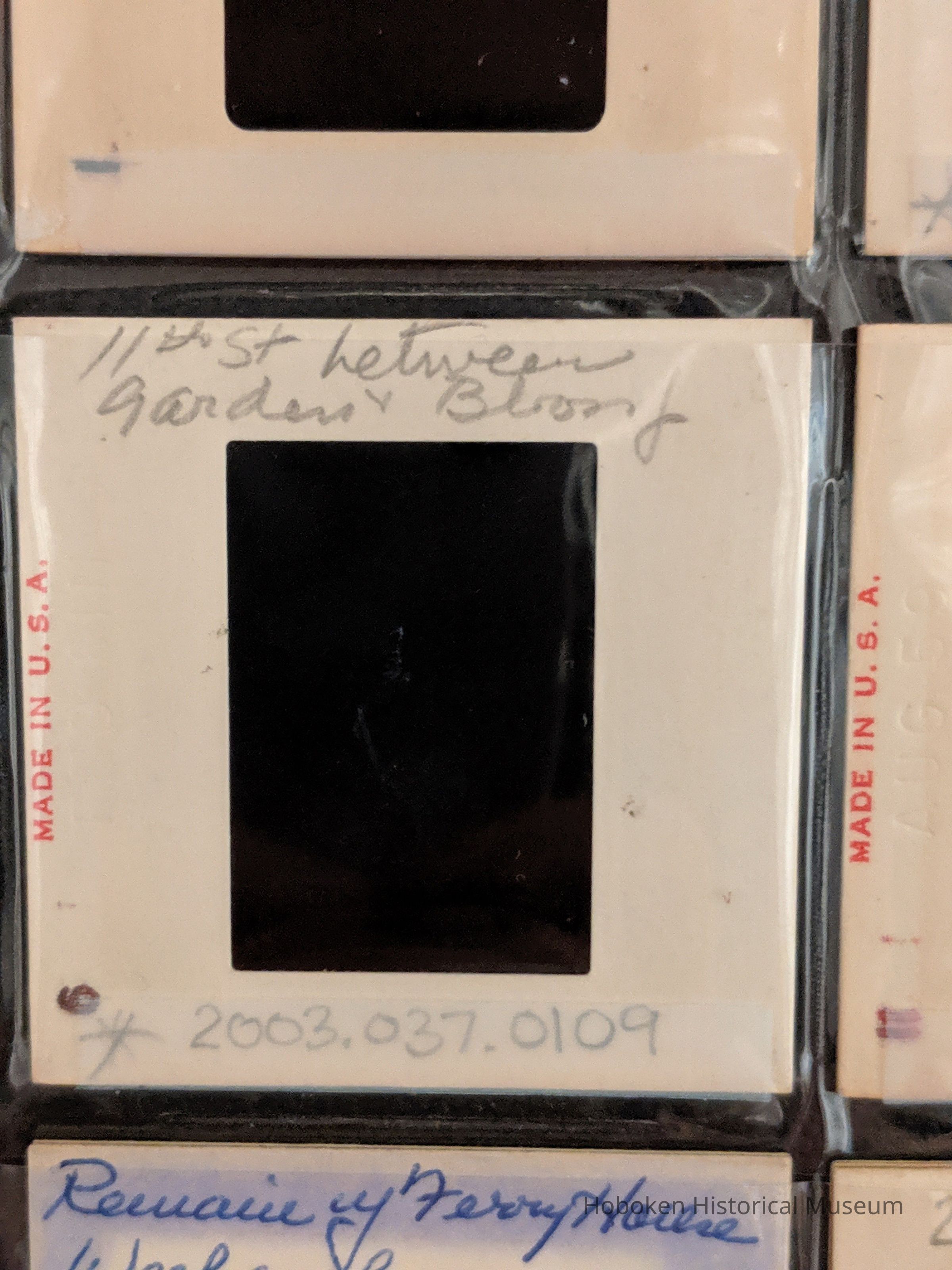 Slide is in a commercial Kodachrome Transparency mount with date "FEB 61" debossed on the side. Photographer's own handwritten label "11th St between Garden v Bloomf" in pencil, is on top of the slide and a pencil astericks is in the lower left corner.