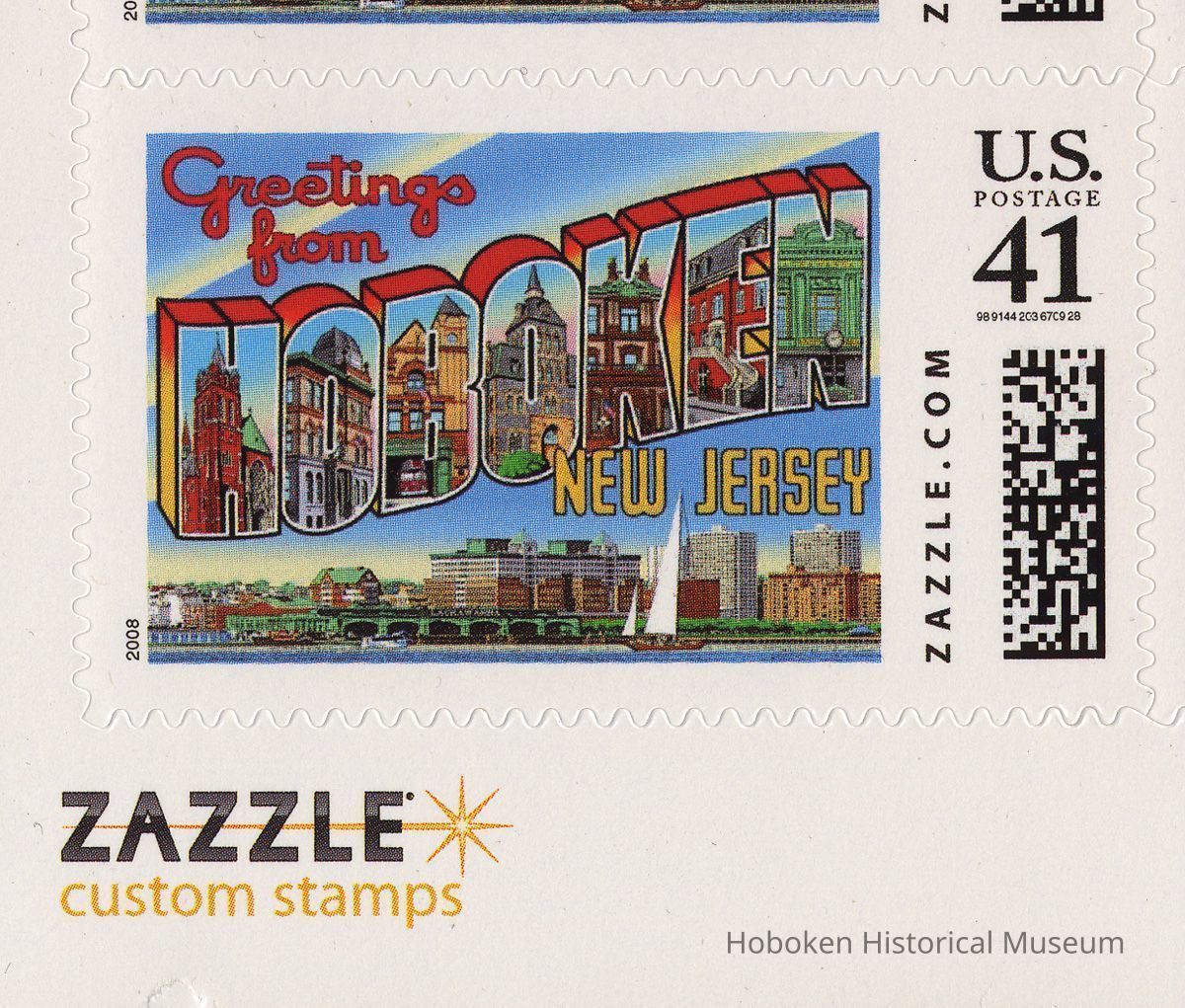 Pane of custom postage stamps: Greetings from Hoboken, New Jersey. Created by Hoboken artist Raymond Smith, 2007. Sheet, 8-1/2" high x 11" wide, of twenty 41 cent self-adhesive stamps, each 1-1/2" high x 2-1/2" wide.