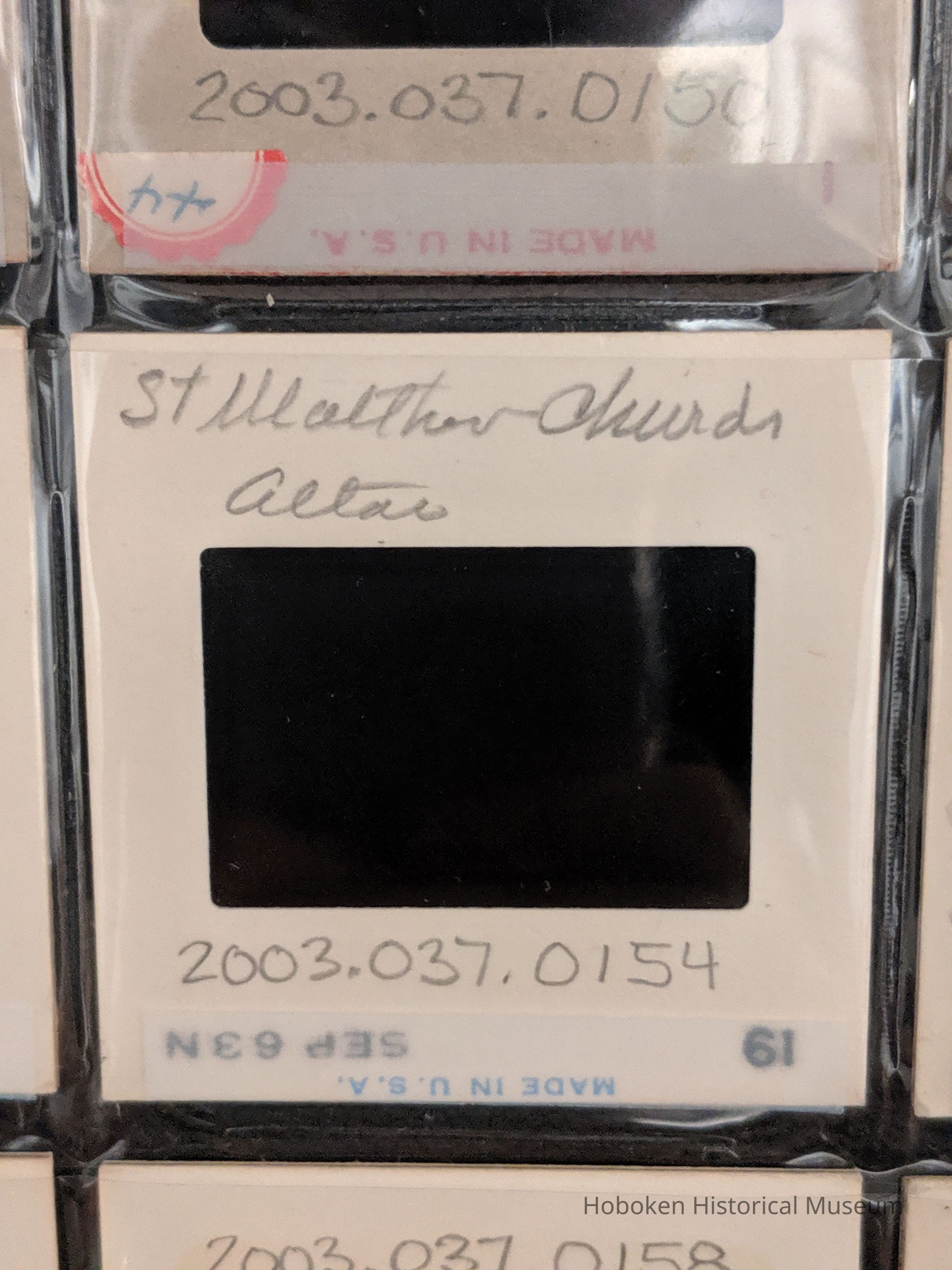 Slide is in a commercial Ektachrome Transparency mount with the date "SEP 63" printed on the bottom. Photographer's own handwritten label "St Matthew Church Alter" is in pencil on the top of the slide.