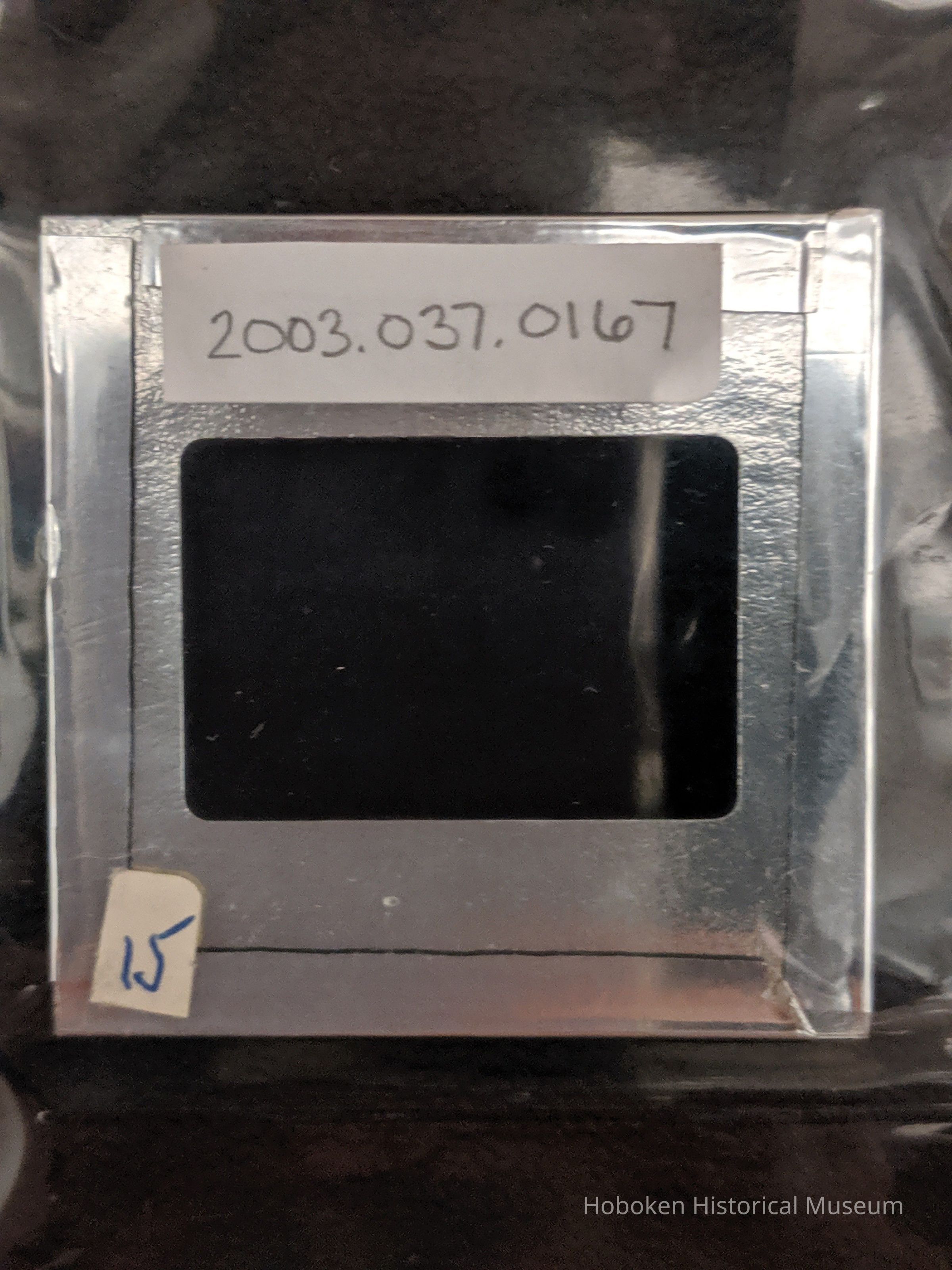 Slide is in a glass mount with photographer's own white sticker in lower left corner with a handwritten "15" in pen. On back of slide is photographer's own typewritten address label that reads: