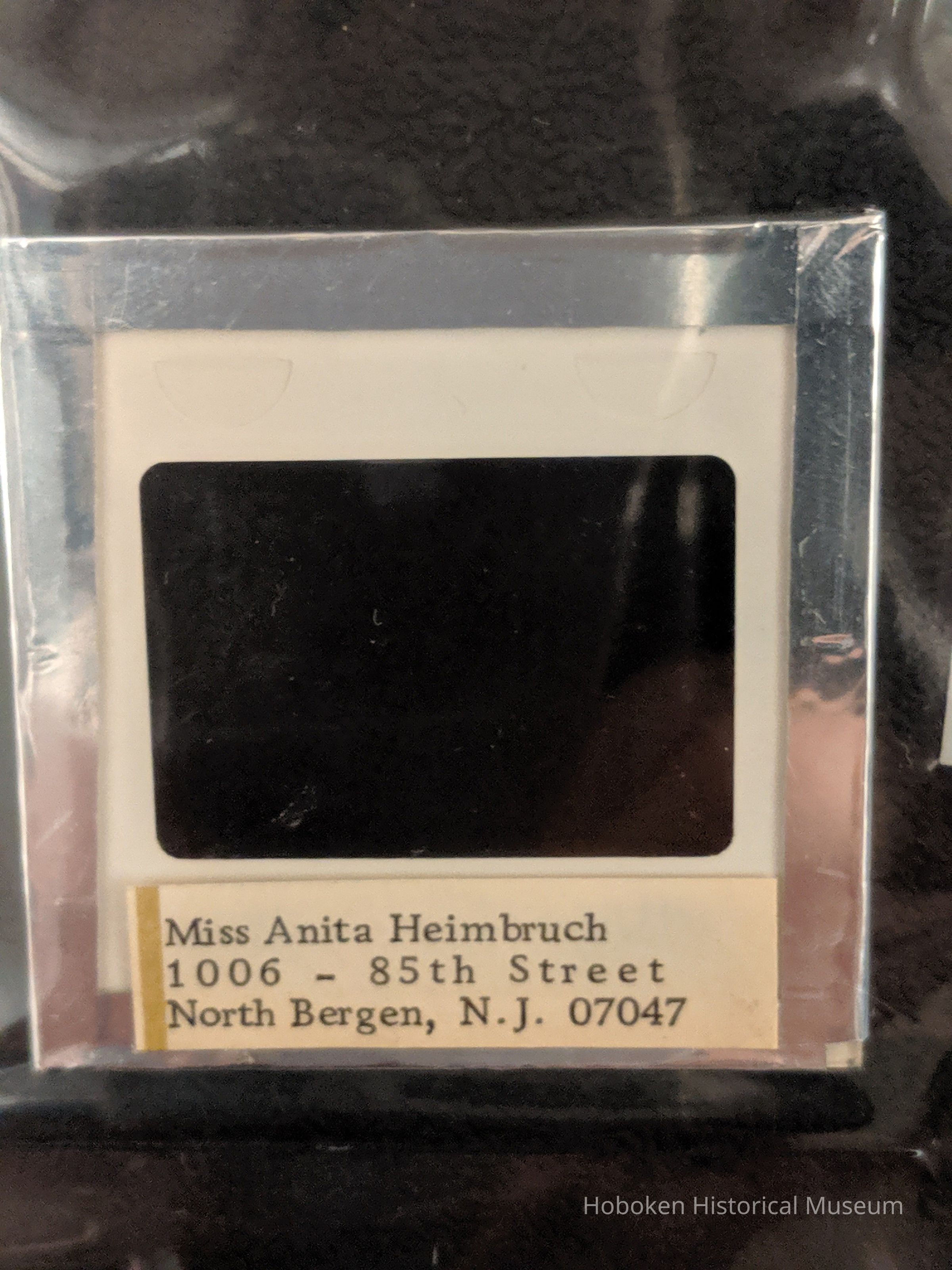 Slide is in a glass mount with photographer's own typewritten address label on back that reads:
