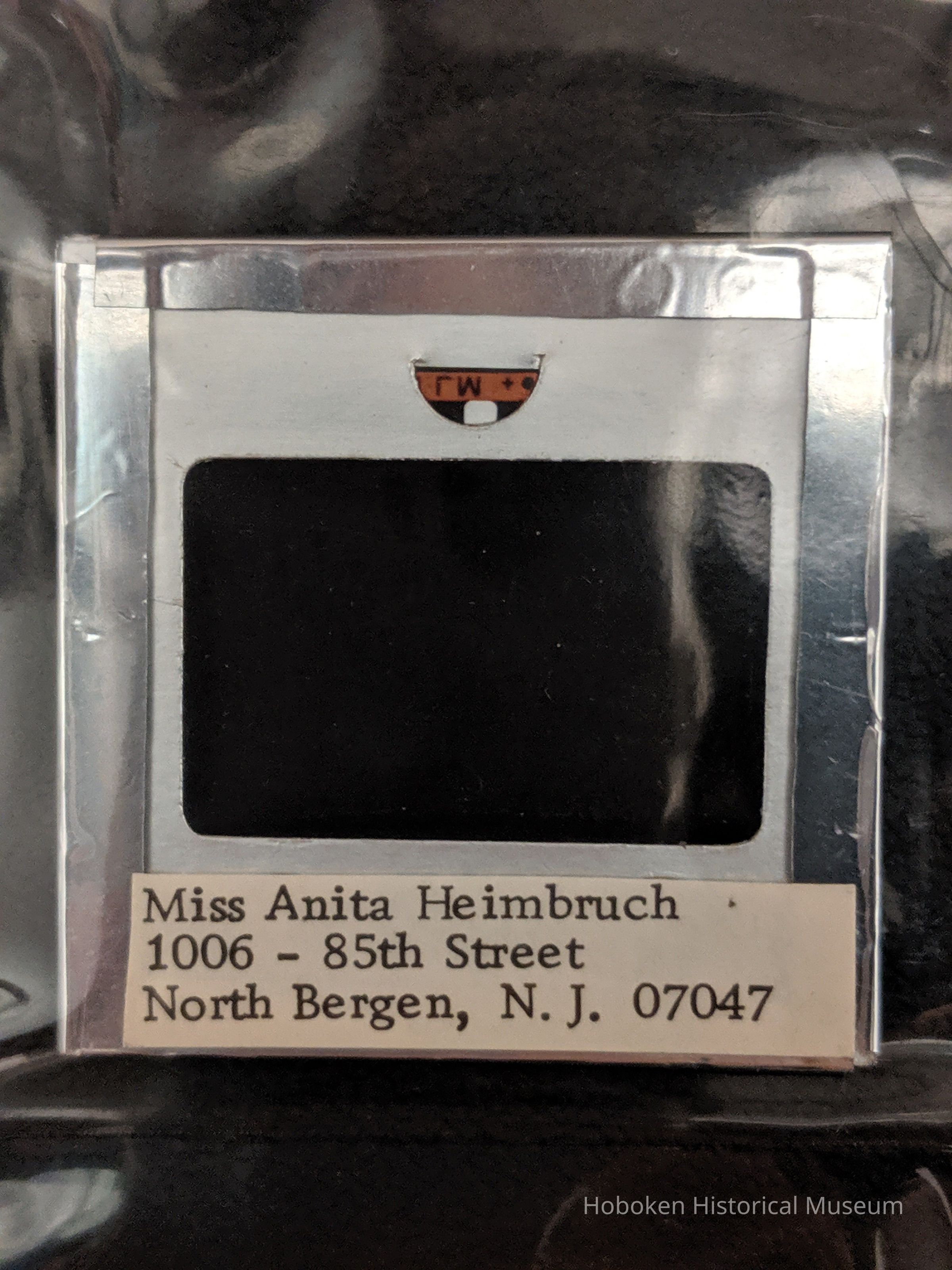 Slide is in a glass mount with photographer's own typewritten address label on back that reads: