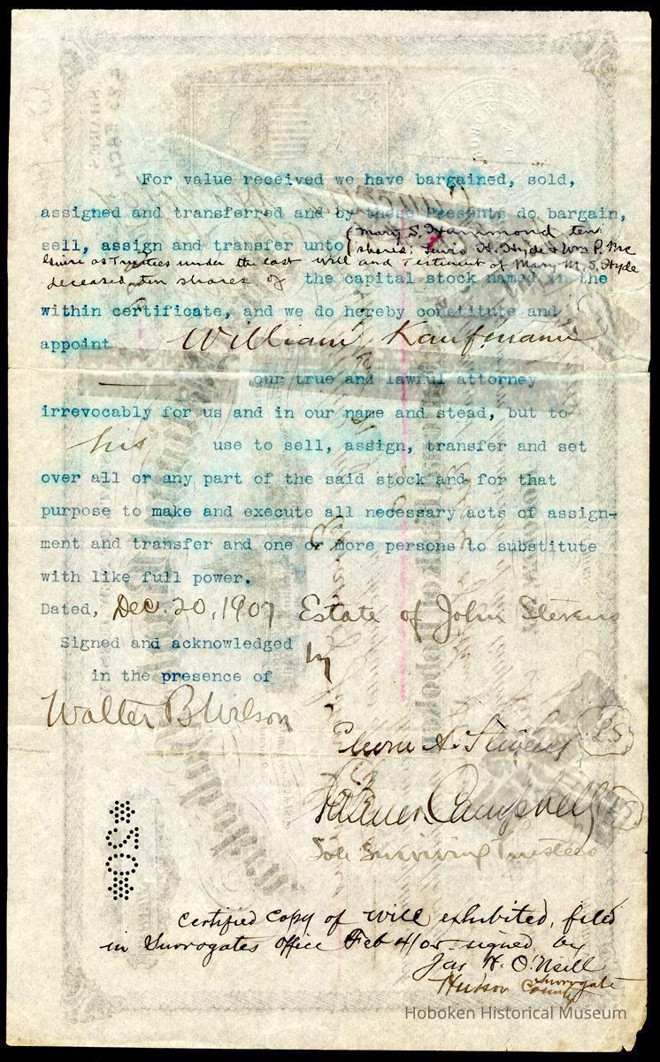 Typewritten form text on reverse with holographic entries surrendering the stock with its transfer to other people on Dec. 20, 1907. (On that date ten shares were assigned to Mary S. Hammond and the other ten went to Louis H. Hyde and William P. McGuire as trustees of the estate of Mary M. Hyde. William Kaufman had the Stevens estate's power of attorney to execute the transfer. The document is signed as LS by Edwin A. Stevens (not indicated if II or III) and Palmer(?) Campbell, sole surviving trustees.)