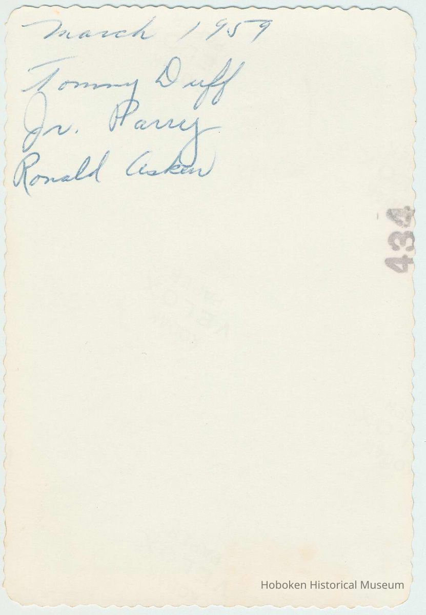 Black-and-white photo of 3 boys (left to right: Tommy Duff, Junior Perry, Ronald Askew) playing on Willow Terrace, Hoboken, March, 1959. 5" wide x 3-1/2" high print. Reverse has contemporary holographic ink identification of the boys plus processor's ink number: 434.
