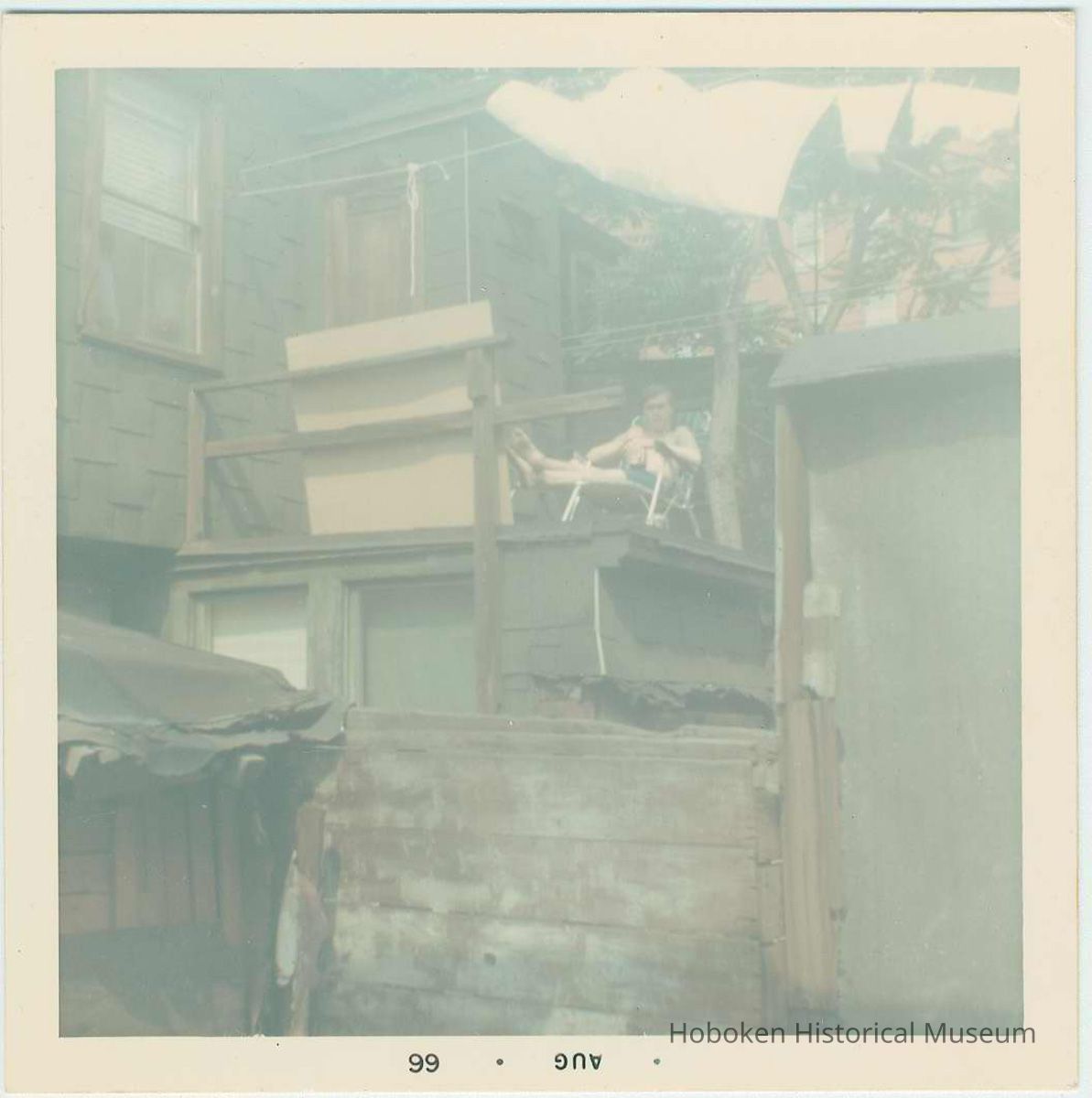 Color photo of a man on a rear deck of a Willow Terrace house, Hoboken, August 1966. 3-1/2" wide x 5" high print. Reverse is blank.