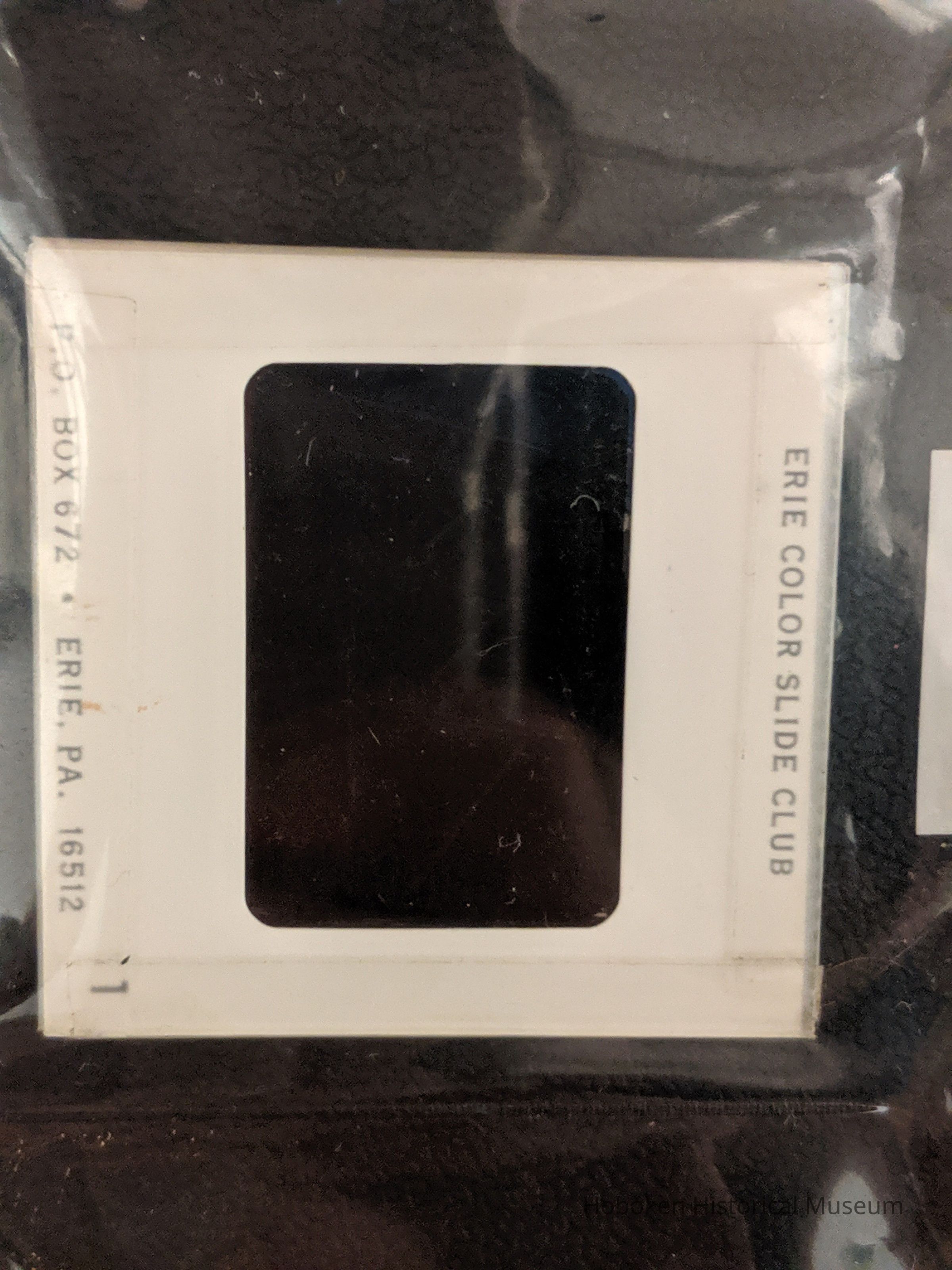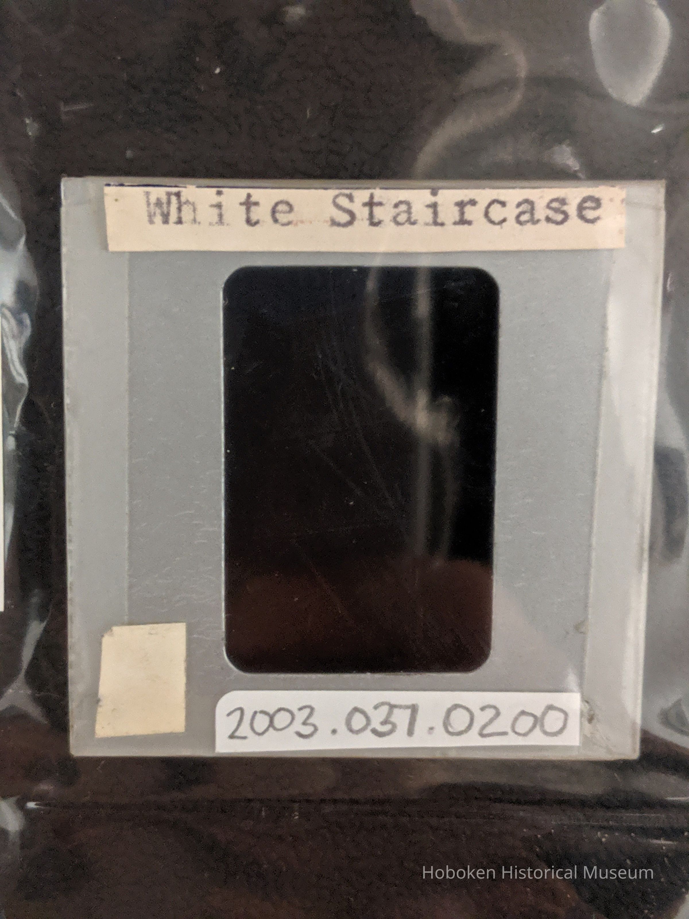 Slide is in a glass mount with photographer's own typewritten label "White Staircase" on the front top and a blank white sticker in the lower left corner. The back of the mount has "ERIE COLOR SLIDE CLUB" typed on top and "P.O. BOX 672 * ERIE. PA. 16512" typed on bottom.